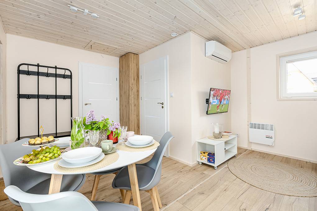 PL 33.10 Ferienhaus 1-5 Pers.: 2 -Zimmer-Ferienhaus mit 45 qm Wohnfläche. Wohn-/Essraum mit Couch (Schlafsofa 2 Pers.), Flachbild Sat-TV mit deutschen Programmen, Esstisch, Küchenzeile (2 Induktionsplatten, Mikrowelle, Spülmaschine). 3-Bettzimmer mit Sat-TV. Modernes Bad: Dusche, Wb, WC. Terrasse mit Sitzmöbeln, Grill, schönem Blick.