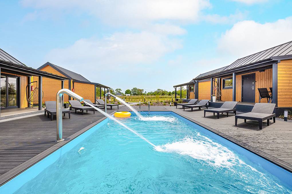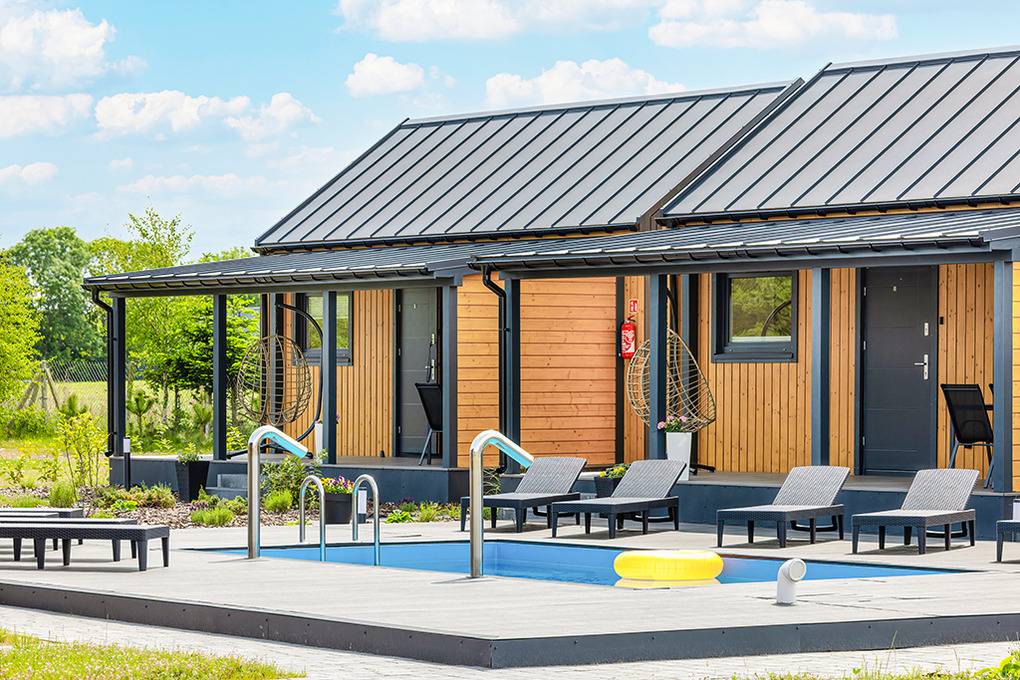 Haus: Gepflegte Ferienhaus-Anlage mit Pool und Rezeption, in 2025 neu erbaut. Holzferienhäuser mit moderner Einrichtung. Kostenloses Internet über WiFi. Heizung über Klima-Anlage und E-Radiator. Warmwasser über E- Boiler (60 l). Terrasse mit Sitzmöbeln, Grill. 1 Pkw-Stellplatz/Haus.