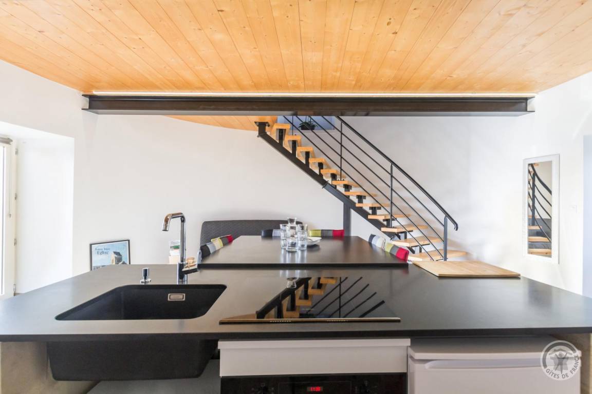 Freistehendes Haus auf drei Ebenen. Wohnzimmer (TV, WLAN) mit offener Küche (Backofen, Induktionskochfeld, Kühlschrank mit Gefrierfach, Mini-Geschirrspüler, Mikrowelle, Espressomaschine). Kleine Frühstücksecke. Im Obergeschoss: Schlafzimmer 1 auf einer Galerie (1 Doppelbett 140 x 190 cm), Duschbad mit WC. Im Obergeschoss: Schlafzimmer 2 auf einer Galerie (1 Kingsize-Bett 180 x 200 cm) mit TV. Babyausstattung auf Anfrage. Elektrische Heizung inklusive. Alle Nebenkosten inklusive. Bettwäsche und Handtücher werden gestellt. Die Betten sind bei Ankunft bezogen. Reinigungsservice gegen Aufpreis. Privater, umzäunter Garten, Terrasse, Gartenmöbel, Sonnenliegen, angrenzender Hauswirtschaftsraum (Waschmaschine), Bouleplatz. Parkplatz.