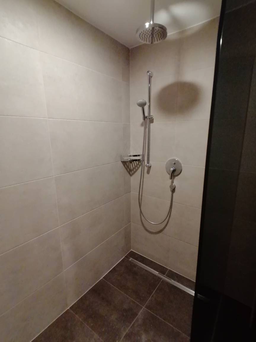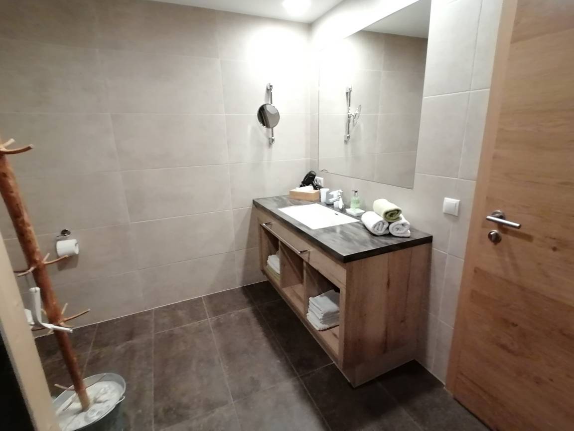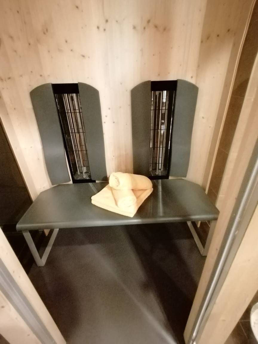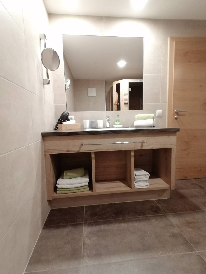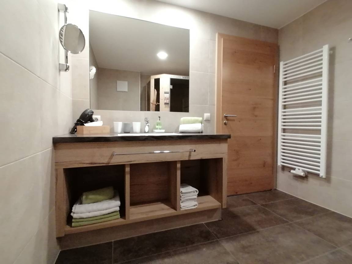 Großes, modernes Bad, einer Dusche mit Regendusche und WC, Handtuchtrockner, Föhn, großer Spiegel, Kosmetikspiegel. Ein separates WC ist vorhanden. Infrarotkabine für 2 Personen!