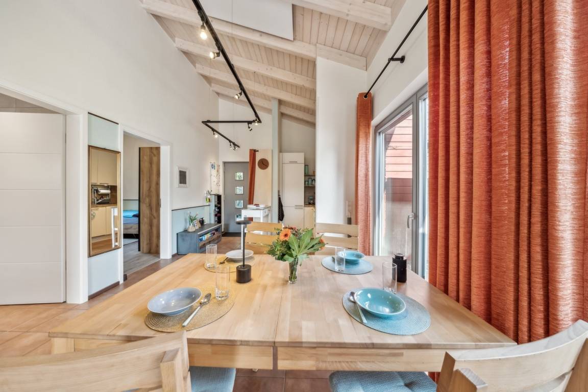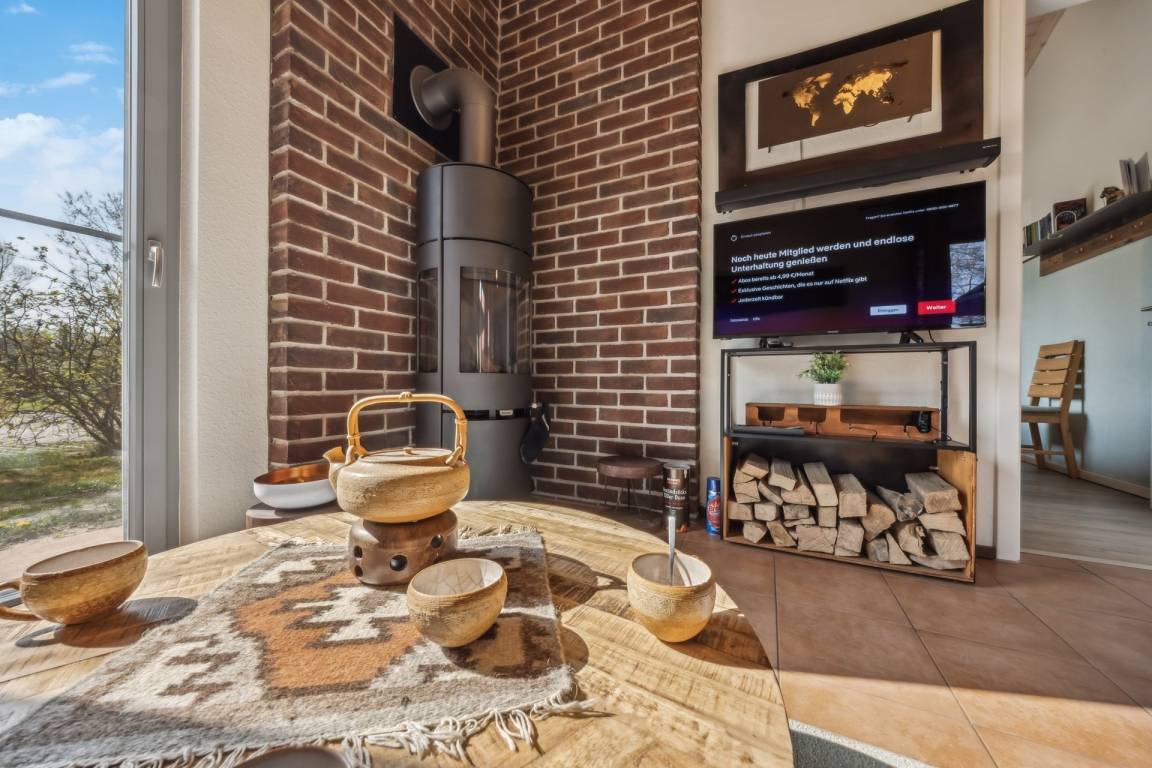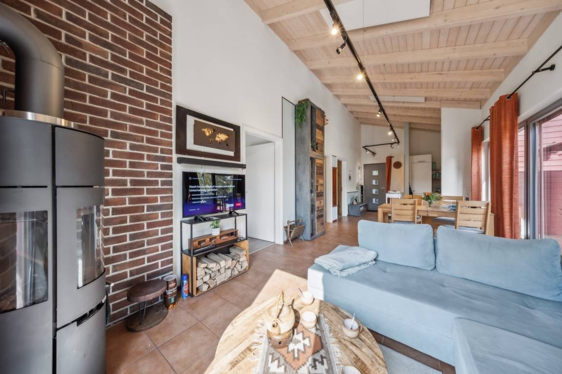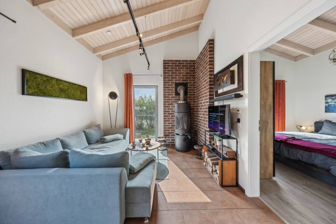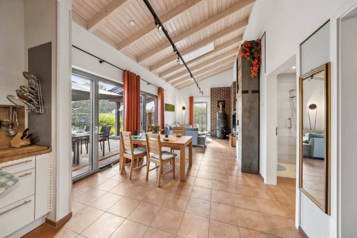 Wenn Sie ins Haus kommen, fällt Ihnen sofort die kathedralenartige Höhe auf. Verbunden mit einer hervorragenden Dämmung, gewährleistet sie im Sommer immer eine frische Kühle. Das Haus ist in Wohnhausqualität gebaut. Das raumhohe, bodentiefe Wohnzimmerfenster, das helle Holz der schräg zum Giebel hochlaufenden Decke und der rötliche Terracotta-Fliesenboden lässt das Haus immer sonnig erscheinen. In der Kaminecke steht der elegante, dänische Holzofen wie eine säulenartige Skulptur. Damit heizen Sie in kalten Zeiten in Windeseile das ganze Haus auf.