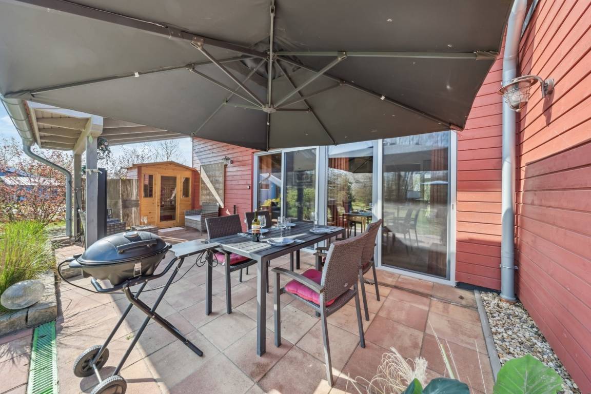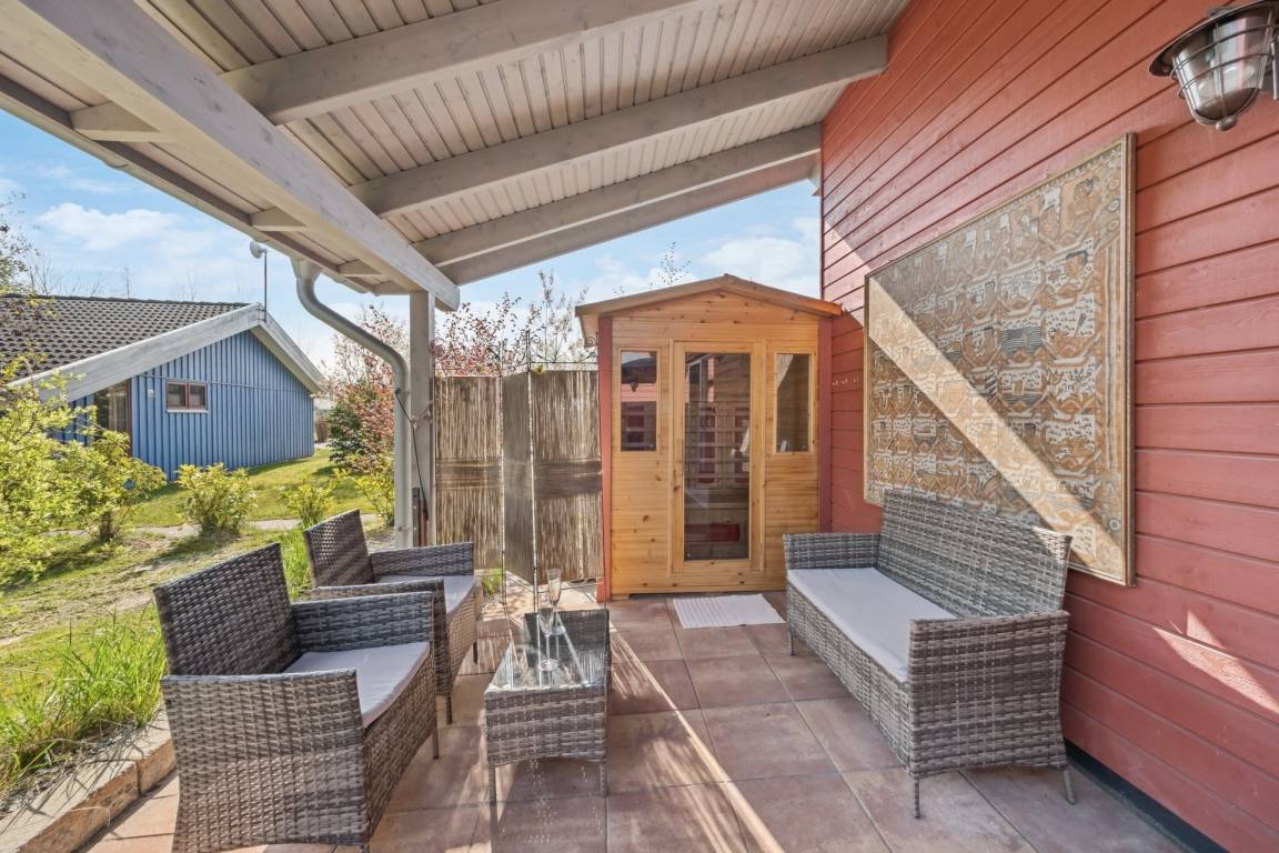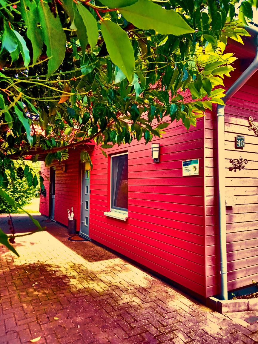 DAS ROTE HOLZHAUS (72 m² Wohnfläche) ist luftig hoch gebaut, großzügig und zugleich praktikabel und elegant. Es gibt zwei Schlafzimmer (eins mit Doppelbett, einst mit zwei Einzelbetten), ein großzügiges Badezimmer (mit Badewanne inkl. Whirlpoolfunktion) und einen großen Wohnraum mit offener Küche und Kamin.