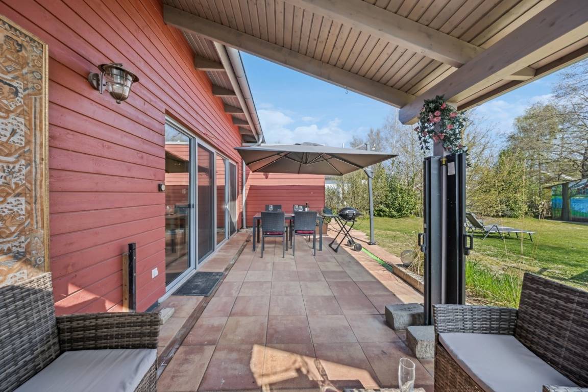 Der geräumige Carport ist seitlich angelegt und überdacht den Hauseingang. So können Sie Urlaubsgepäck und Einkäufe immer trocken direkt vom Auto ins Haus bringen. Und ein Rollstuhl kann direkt vom Auto ins Haus rollen.
