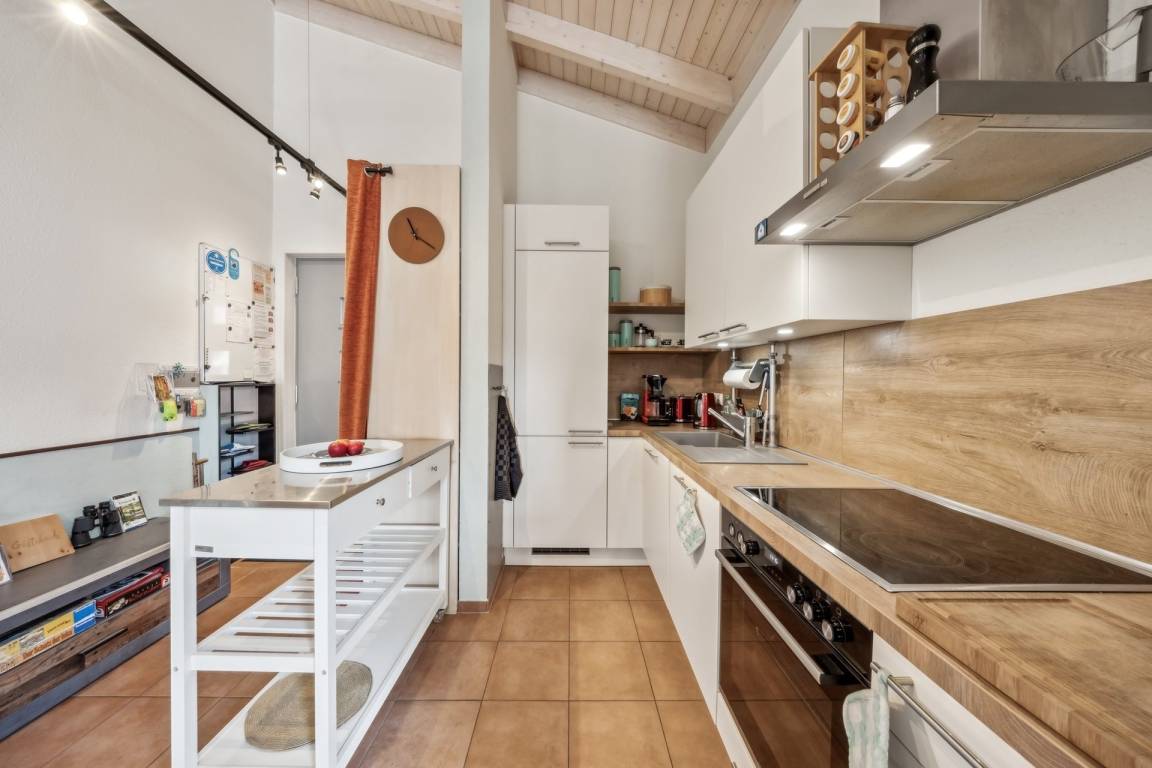 Wenn Sie das Haus betreten, stehen Sie gleich neben dem großen Garderobenschrank. Da können Sie Jacken, Mäntel, Mützen, Hüte und Schuhe unterbringen. Sie überschauen gleich den ganzen Wohnbereich. Zwei Schritte und Sie stehen Sie auch schon vor dem offenen Küchenbereich. Also kurze Wege mit den Einkäufen.