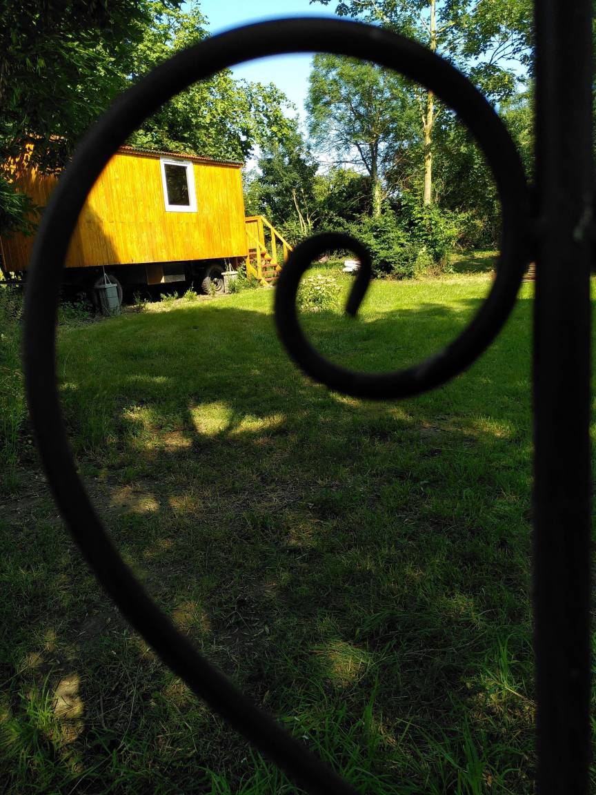 Der Zirkuswagen steht auf einer seperaten Wiese mit Weitblick zum Feld.