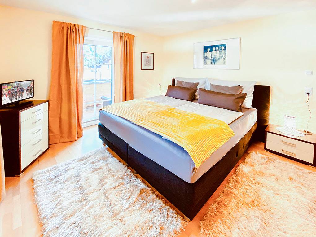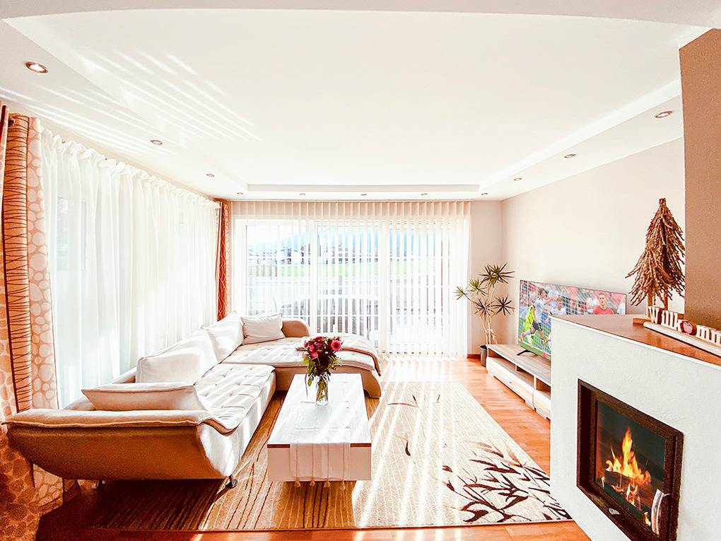 A 257.81 Ferienhaus 2-6 Pers.: Komfortables 3 1/2-Zimmer-Reihenhaus mit 110 qm Wohnfläche über 2 Etagen. Separater Eingang. Parterre: Großzügiger Wohn-/Essraum mit Sitzgarnitur vor dem Sat-TV, Esstisch, Eckbank, Kamin. Vorratsraum mit Schuhtrockner. Moderne Küche mit hochwertiger Küchenzeile (Backofen, Kaffeevollautomat, Spülmaschine.). Separates WC. 1. Etage: Zwei 3-Bettzimmer mit Doppelbett, Einzelbett, Sat-TV, Balkon. Zwei Bäder, das eine mit Du, Eck-BW, Wb, das andere mit Du, Wb. Separates WC. Vom Wohnraum Zugang zur Terrasse mit Liegen, Whirlpool, schönem Bergblick.