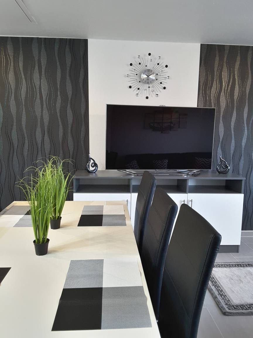 Ferienwohnung für 6 Personen mit kombiniertem Ess/Wohnbereich sowie zwei separate Schlafzimmer und einem Bad mit Dusche.