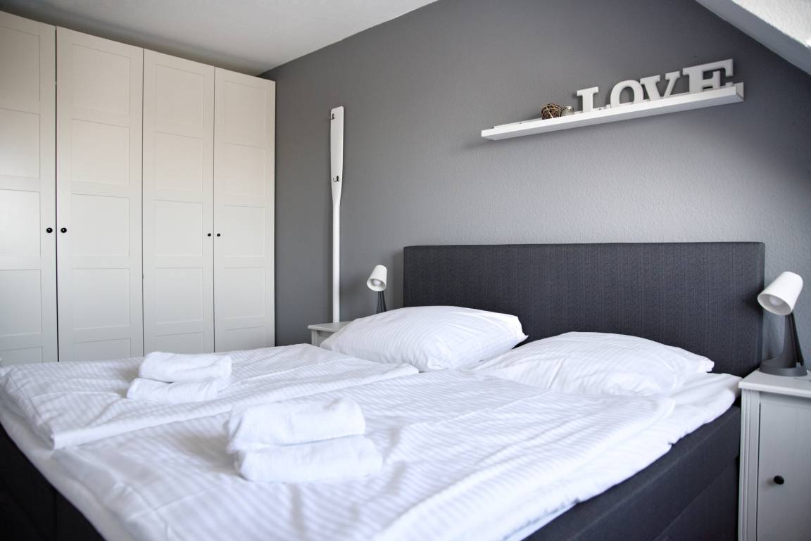Das Wohnzimmer verfügt über einen großen Esstisch mit sechs Stühlen, ein ausziehbares Schlafsofa mit einem Schlafplatz für zwei Personen und einen Sessel. Multimedial stehen Ihnen ein Flachbildfernseher zur Verfügung. Ihre Ferienwohnung hat einen Kabelanschluss. Auch einige Gesellschaftsspiele warten hier schon auf Sie. Die beiden Schlafzimmer sind identisch groß und annähernd gleich geschnitten. In beiden Schlafzimmern stehen Ihnen ein Doppelbett, Nachttische und jeweils zwei große Kleiderschränke zur Verfügung.