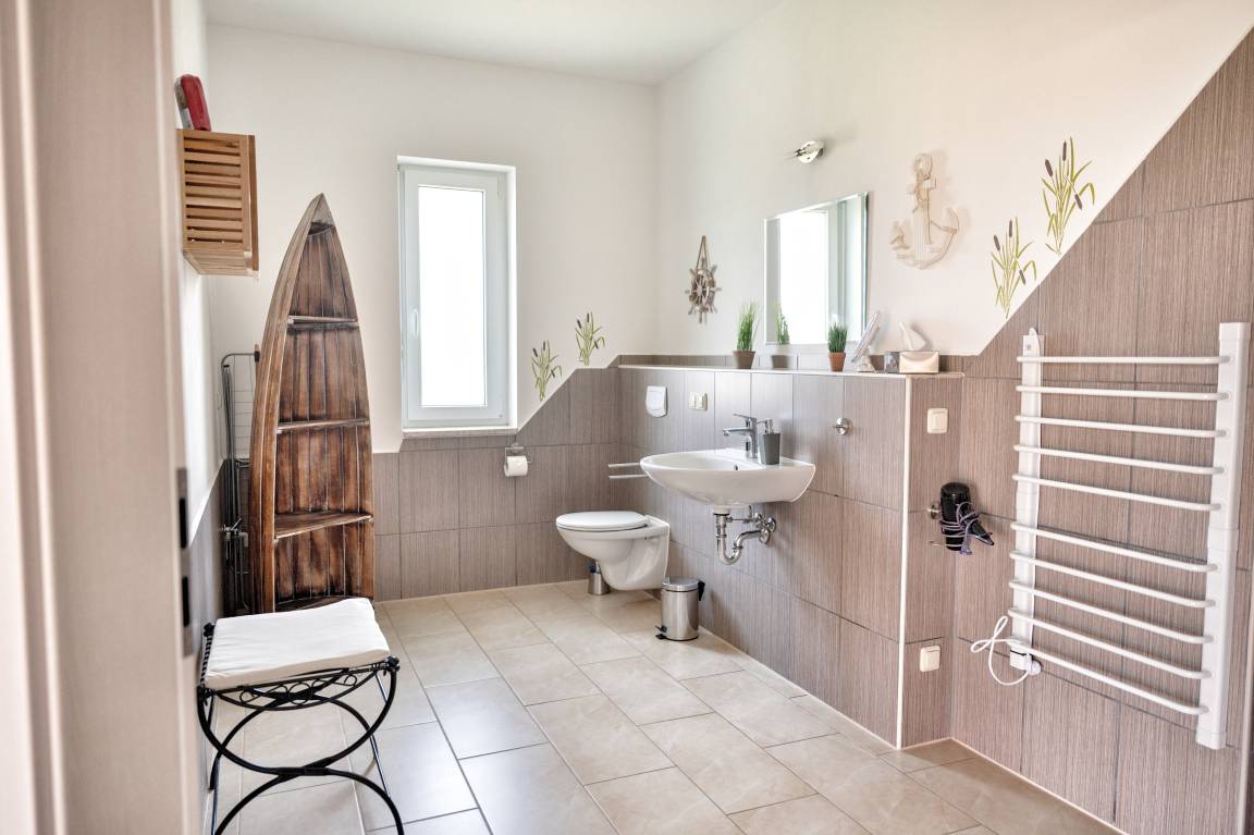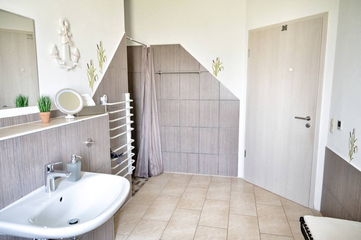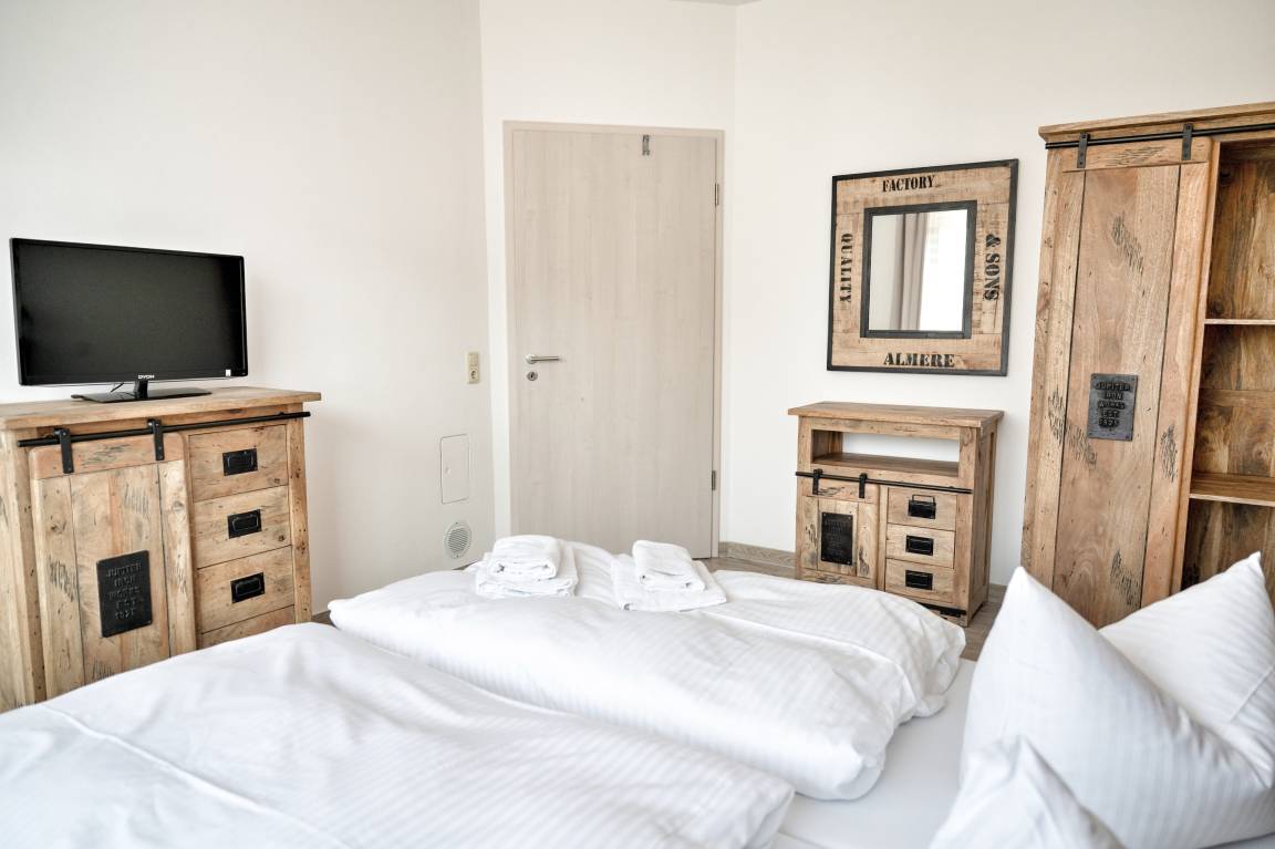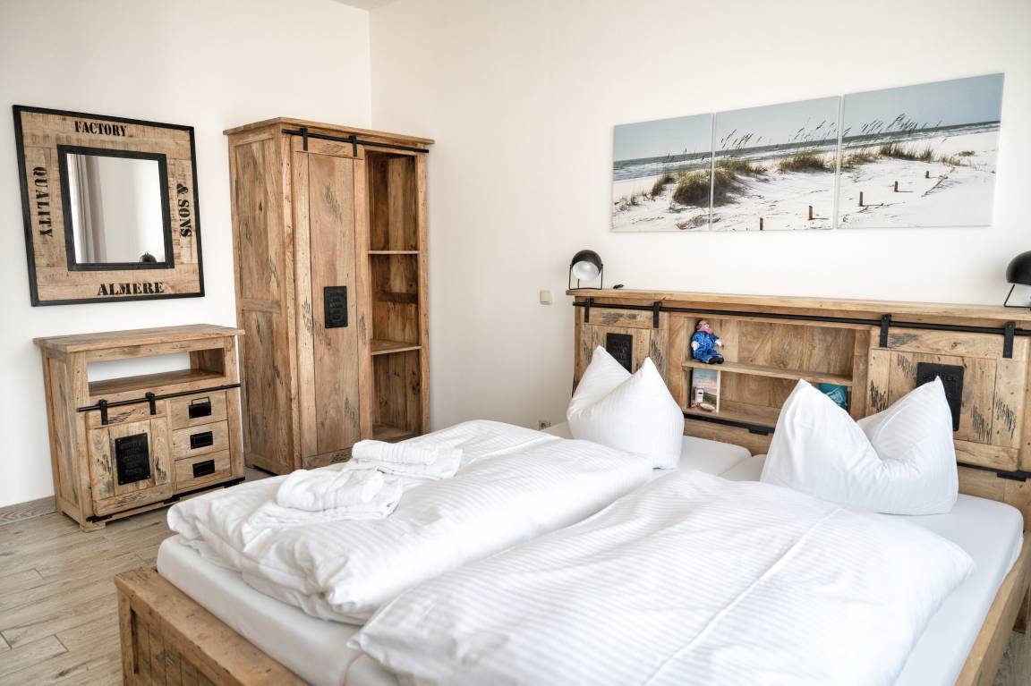 Ihr Schlafzimmer ist mit einem großes Doppelbett mit einer Liegefläche von 180 cm x 200 cm ausgestattet. Des weiteren finden Sie hier für Ihre Nutzung Nachttische und Verstaumöglichkeiten. Das Badezimmer ist mit einer großen Dusche ausgestattet. Ihre mitgebrachten Badezimmerutensilien finden in einem maritimen Regal ihren Platz.
