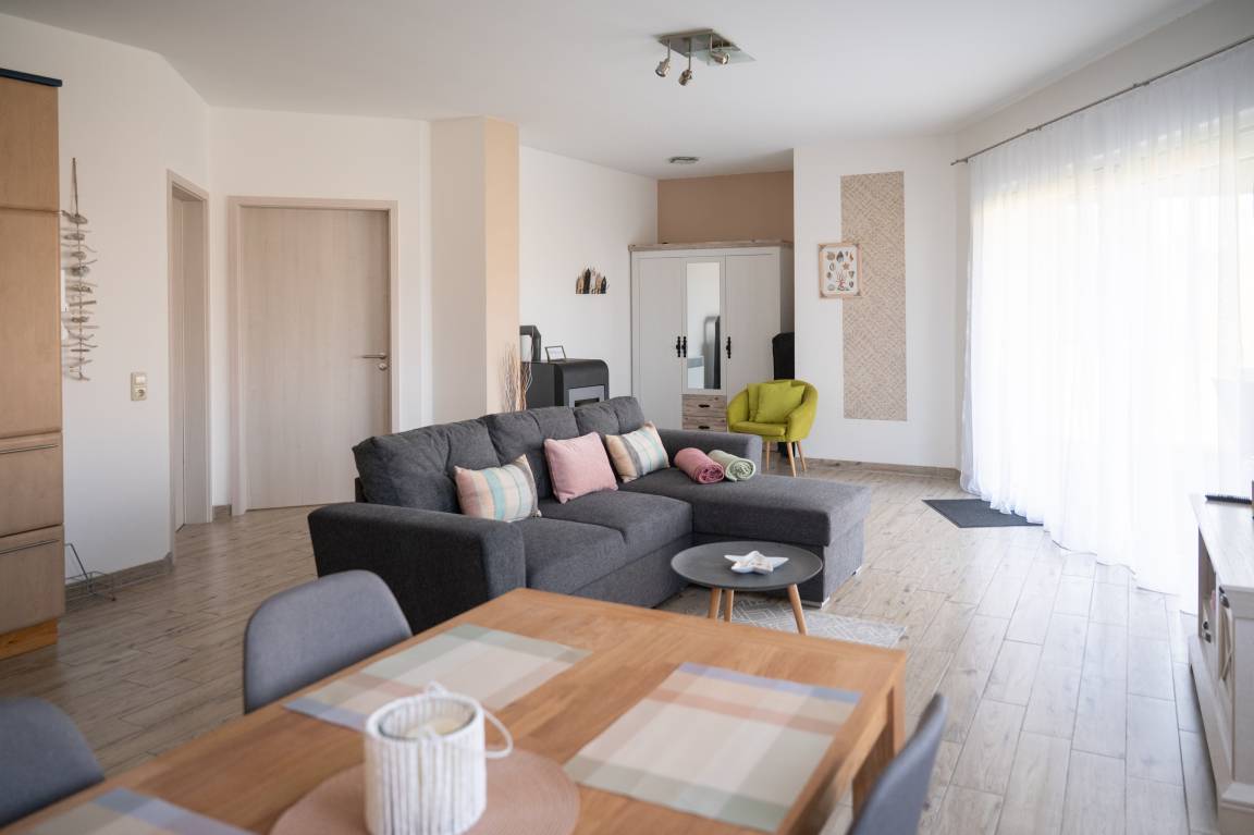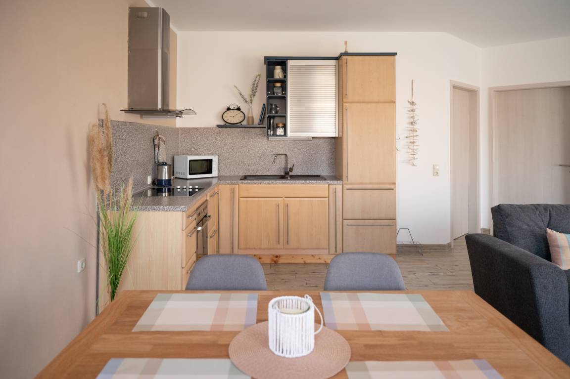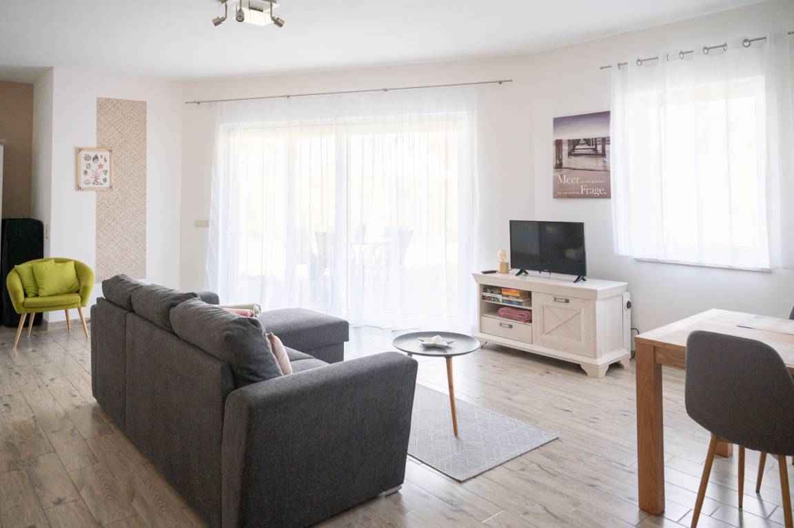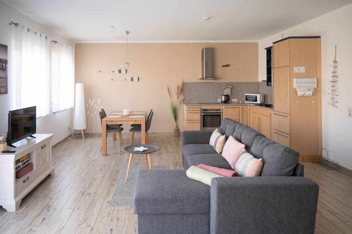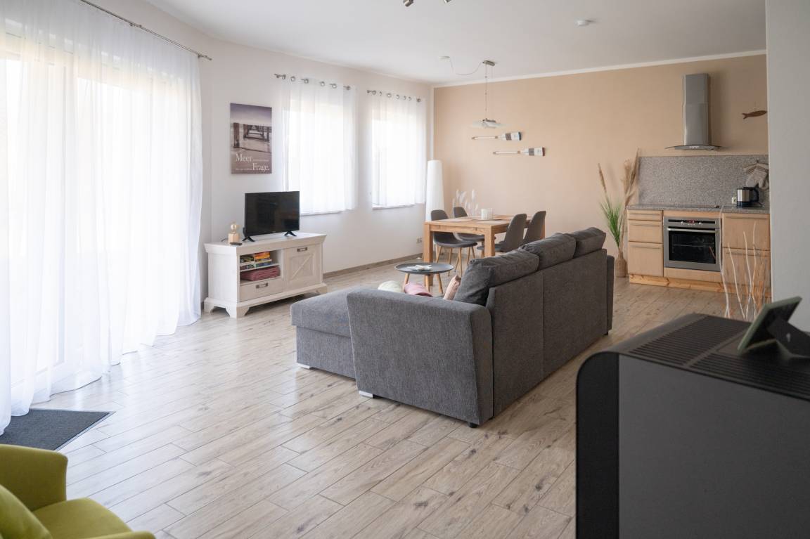 Ihr gemütliches Wohnzimmer ist mit einer Couch ausgestattet. Multimedial stehen Ihnen hier ein Flachbildfernseher und WLAN zur Verfügung. Auch einige Gesellschaftsspiele können hier von Ihnen genutzt werden. Ebenfalls ist in Ihrem Wohnzimmer eine Essecke mit Bänken, Stühlen und einem großen Esstisch vorhanden. Die zum Wohnzimmer hin offene Küche lässt den Raum noch größer wirken. Ihre Küche ist mit Cerankochfeld, Backofen, Geschirrspüler und Kühlschrank ausgestattet. Für die Zubereitung Ihrer Mahlzeiten wird es Ihnen an nichts fehlen.