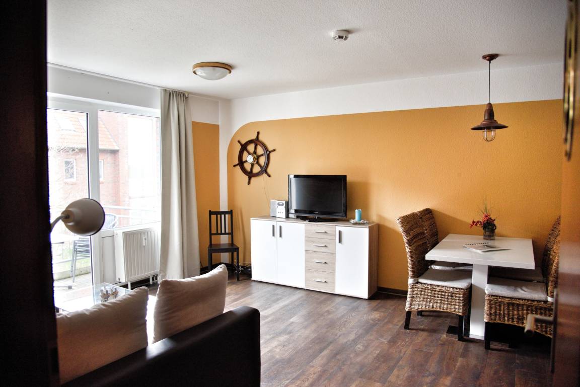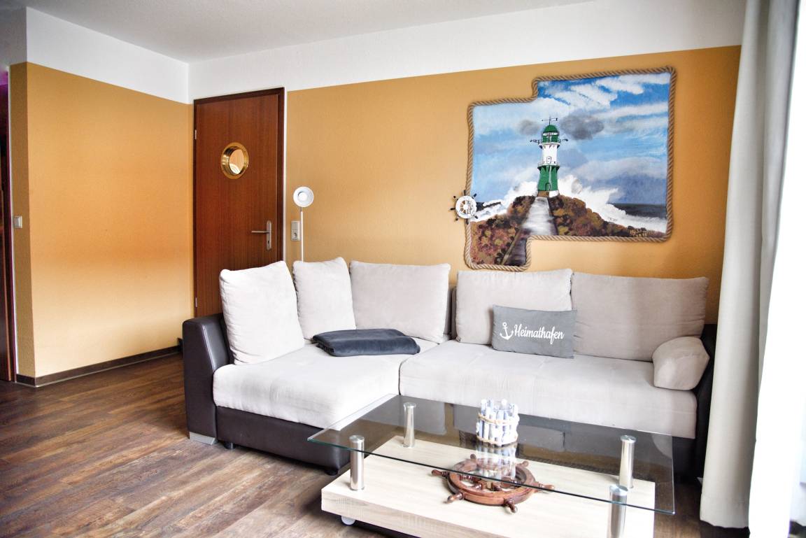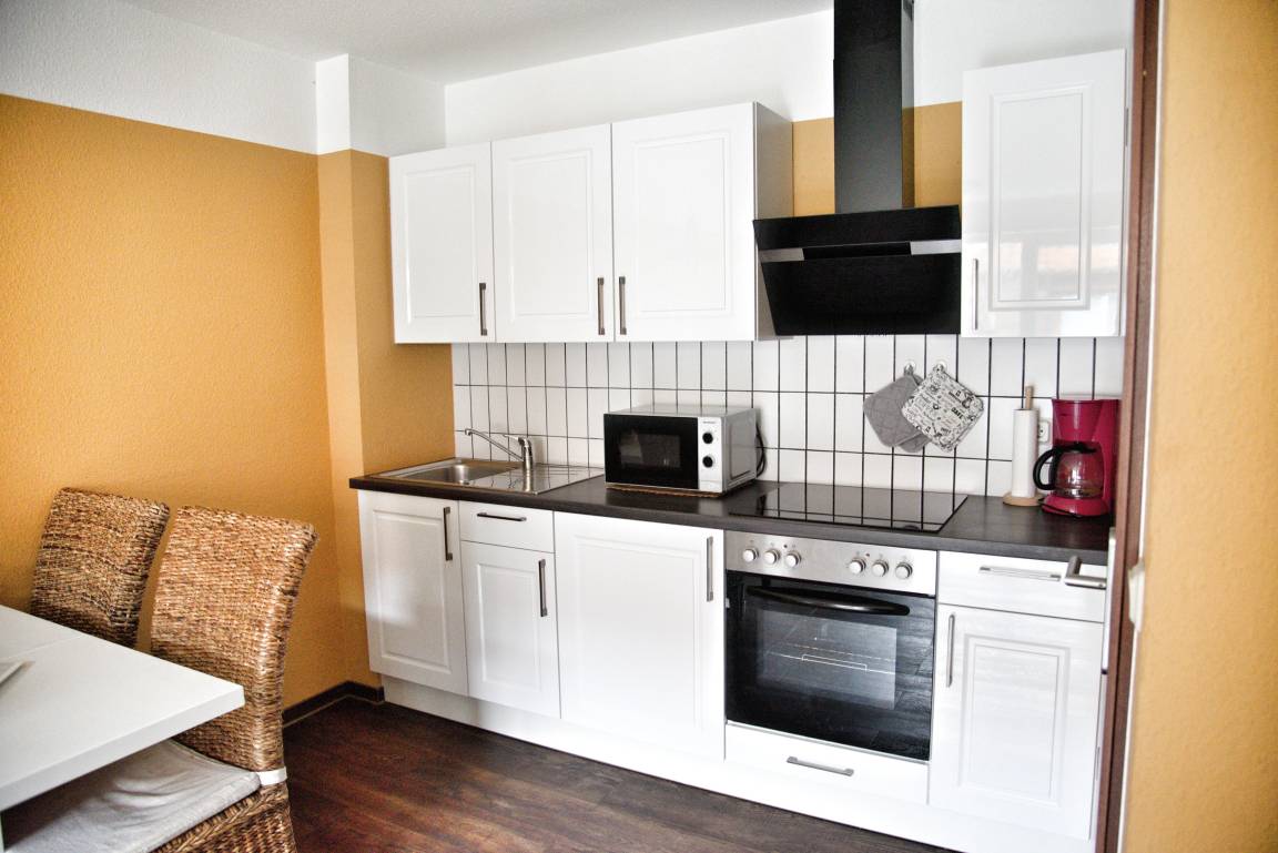 Im Schlafzimmer finden Sie ein Doppelbett sowie einen Kleiderschrank und Ablagemöglichkeiten vor. Hier können Sie Ihre Koffer bequem auspacken. Die Küchenzeile ist gut ausgestattet. Bestandteile sind unter anderem ein Kochfeld, ein Backofen, eine Kaffeemaschine, viel Geschirr sowie ein Kühlschrank mit kleinem Eisfach. Das Badezimmer hat eine Dusche mit Duschkabine und natürlich haben Sie auch hier Ablageflächen. Der Flur beherbergt eine Flurgarderobe und einen Spiegel. Die Ferienwohnung Hol über! liegt im ersten Obergeschoss des Hauses Störtebeker im Eingang 2. Hier befinden sich auch weitere Ferienappartements. Eine gemeinsame Anmietung ist hier sehr gut möglich.