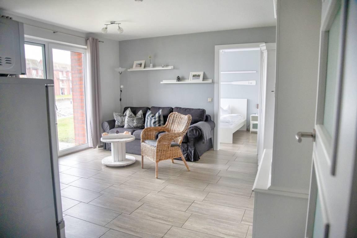 Bei der Ferienwohnung Fock handelt es sich um eine hochwertig eingerichtete, maritim geprägte Nichtraucherwohnung, die sich auf 42 Quadratmetern erstreckt. Aus jedem Fenster und auch von der Terrasse können Sie direkt auf das Hafenbecken der Lagunenstadt schauen. Auf der Terrasse, welche gen Süden ausgerichtet ist, stehen Ihnen vier Stühle, ein Tisch und ein Sonnenschirm zur Verfügung.