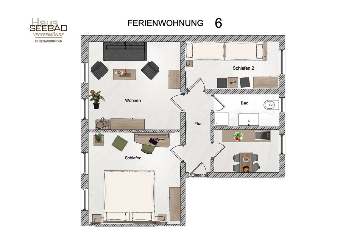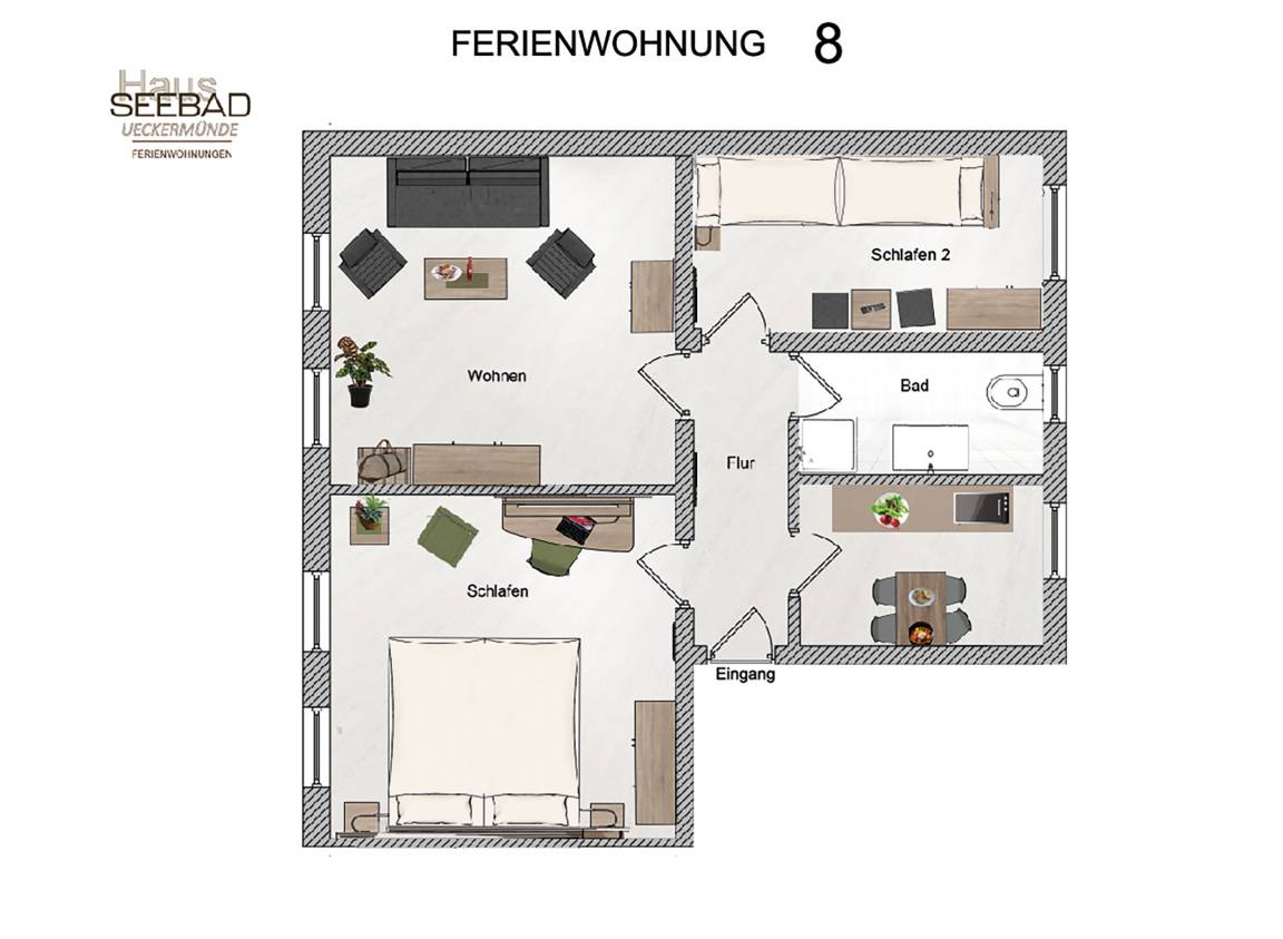 Diese großzügigen 3-Zimmer-Ferienwohnungen bieten Ihnen den idealen Raum für einen erholsamen Aufenthalt und umfassen zwei Schlafzimmer, ein Wohnzimmer, eine voll ausgestattete Küche, ein Badezimmer sowie einen Eingangsflur.