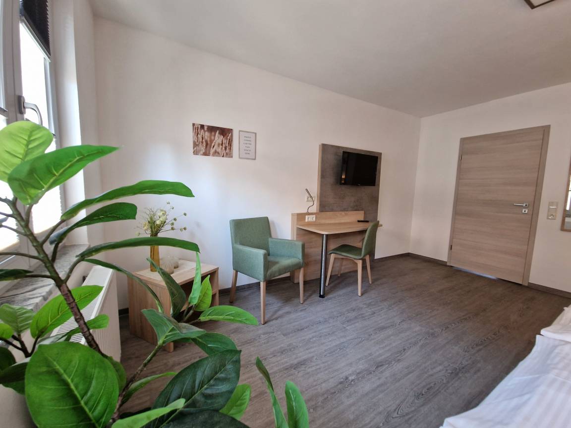 Schreibtisch, Kleiderschrank mit Kofferablage und ein Sessel mit kleinem Tisch für zusätzlichen Komfort