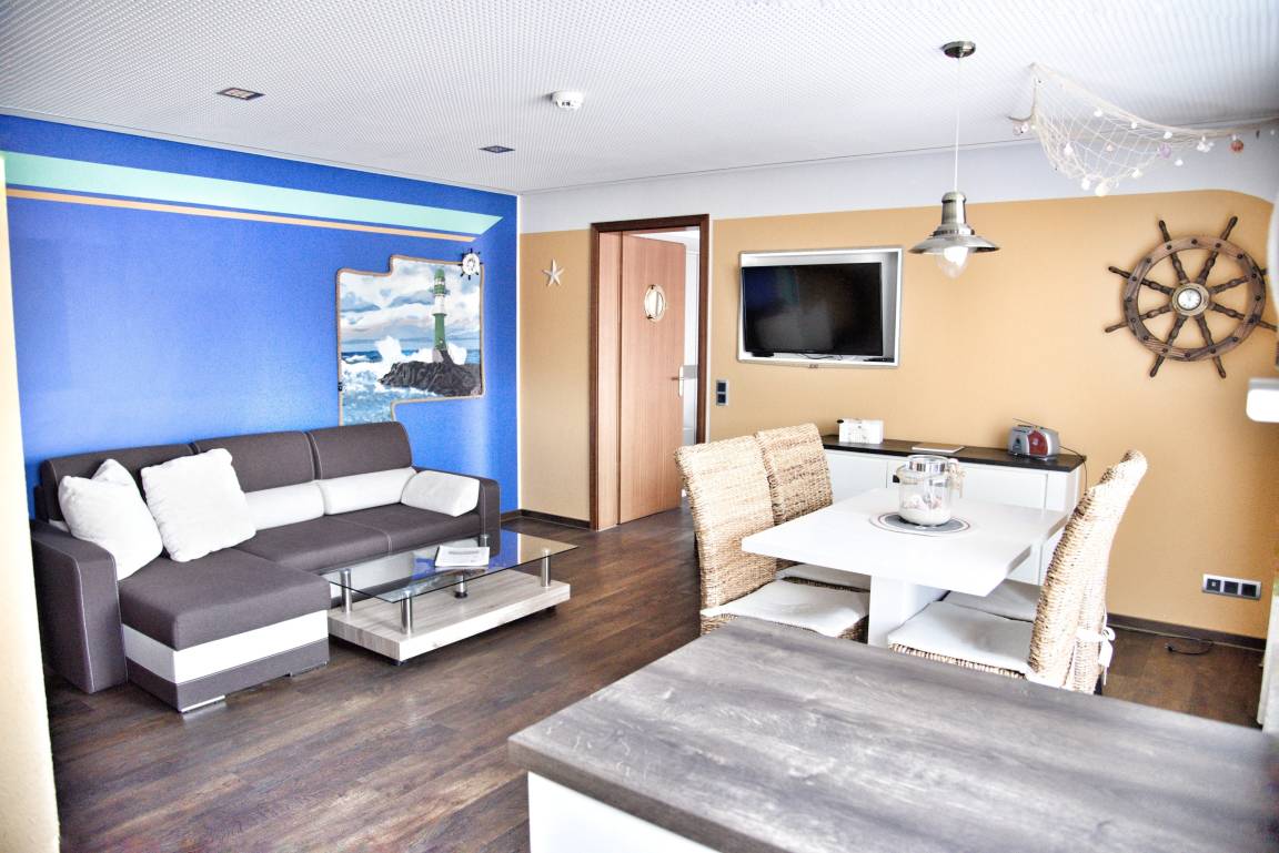Ihr lichtdurchflutetes Wohnzimmer verfügt über einen Esstisch mit vier Stühlen und ein ausziehbares Schlafsofa mit einem Schlafplatz für zwei Personen. Sollten die Tage doch einmal weniger sonnig ausfallen, versüßt Ihnen die indirekte LED-Beleuchtung den Aufenthalt in der Wohnung. Die Wohnküche ist zum Wohnzimmer hin teiloffen, was den Raum noch großzügiger erscheinen lässt. Multimedial steht Ihnen hier ein großer, in die Wand eingelassener Flachbildfernseher zur Verfügung. Ihre Ferienwohnung verfügt über einen Kabelanschluss. Auch einige Gesellschaftsspiele dürfen hier im Bestand nicht fehlen. In Ihrem Schlafzimmer befindet sich ein Doppelbett mit höhenverstellbaren Lattenrosten. Nachtische und Leselampen möchten hier von Ihnen genutzt werden. Der große Schrank wird Ihnen gute Dienste leisten. Ihre Küchenzeile ist voll ausgestattet. Bestandteile sind unter anderem ein Cerankochfeld, eine Kaffeemaschine, viel Geschirr, eine Mikrowelle, eine Backofen sowie eine Kühl- und Gefrierkombination. Kulinarisch sind hier also keine Grenzen gesetzt. In Ihrem Badezimmer finden Sie eine ebenerdige Dusche mit Duschkabine und Ablageflächen vor. Ihr Flur beherbergt eine Garderobe und einen großen Spiegel für Sie. . Das Appartement Flip liegt im Erdgeschoss des Hauses Wikinger, im Eingang 4. In unmittelbarer Nähe dieses Appartements befinden sich weitere Ferienwohnungen unserer Gesellschaft. Eine gemeinsame Anmietung ist hier sehr gut möglich.