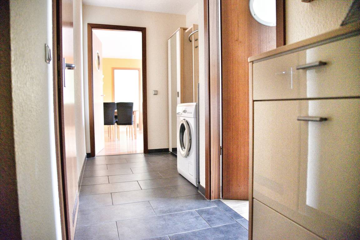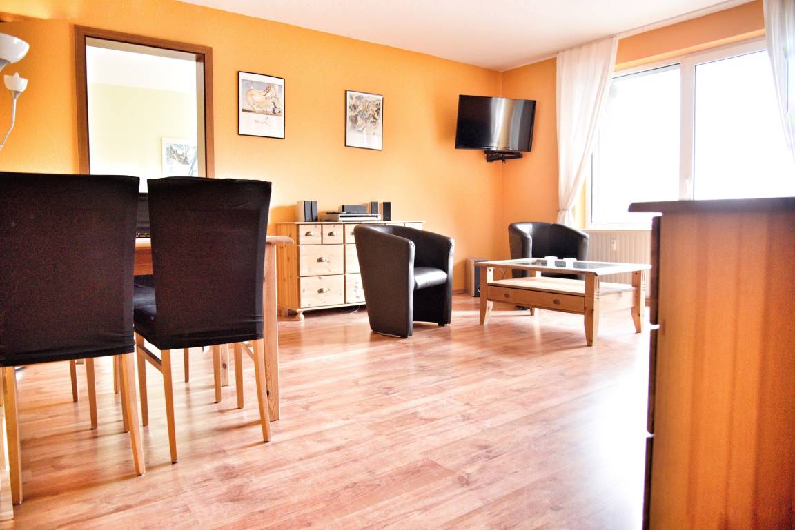 Ihr Wohnzimmer verfügt über einen Esstisch mit vier Stühlen, ein bequemes Sofa und zwei Sessel. Multimedial steht Ihnen ein Flachbildfernseher zur Verfügung. Ihre Ferienwohnung hat einen Kabelanschluss. Auch einige Gesellschaftsspiele warten hier schon auf Sie. In Ihrem großen Schlafzimmer befindet sich ein Doppelbett. Die großen Kleiderschränke werden Ihnen gute Dienste leisten. Im kleinen Schlafzimmer finden Sie ein Hochbett und ein zusätzliches Einzelbett vor. Ihre moderne Einbauküche ist für Sie voll ausgestattet. Bestandteile sind unter anderem Cerankochfeld, Backofen, Kaffeemaschine, Mikrowelle, viel Geschirr, ein Kühlschrank mit kleinem Gefrierfach und vieles mehr. Ihr Badezimmer hält eine Dusche mit Duschkabine, Ablageflächen und einen Fön für Sie bereit. Im Flur finden Sie eine Garderobe, einen großen Spiegel und Reinigungsgeräte vor.