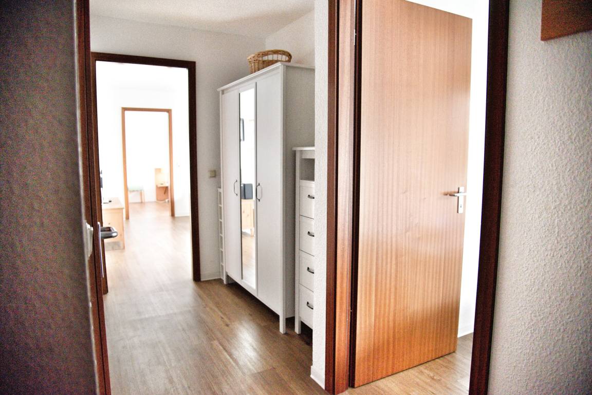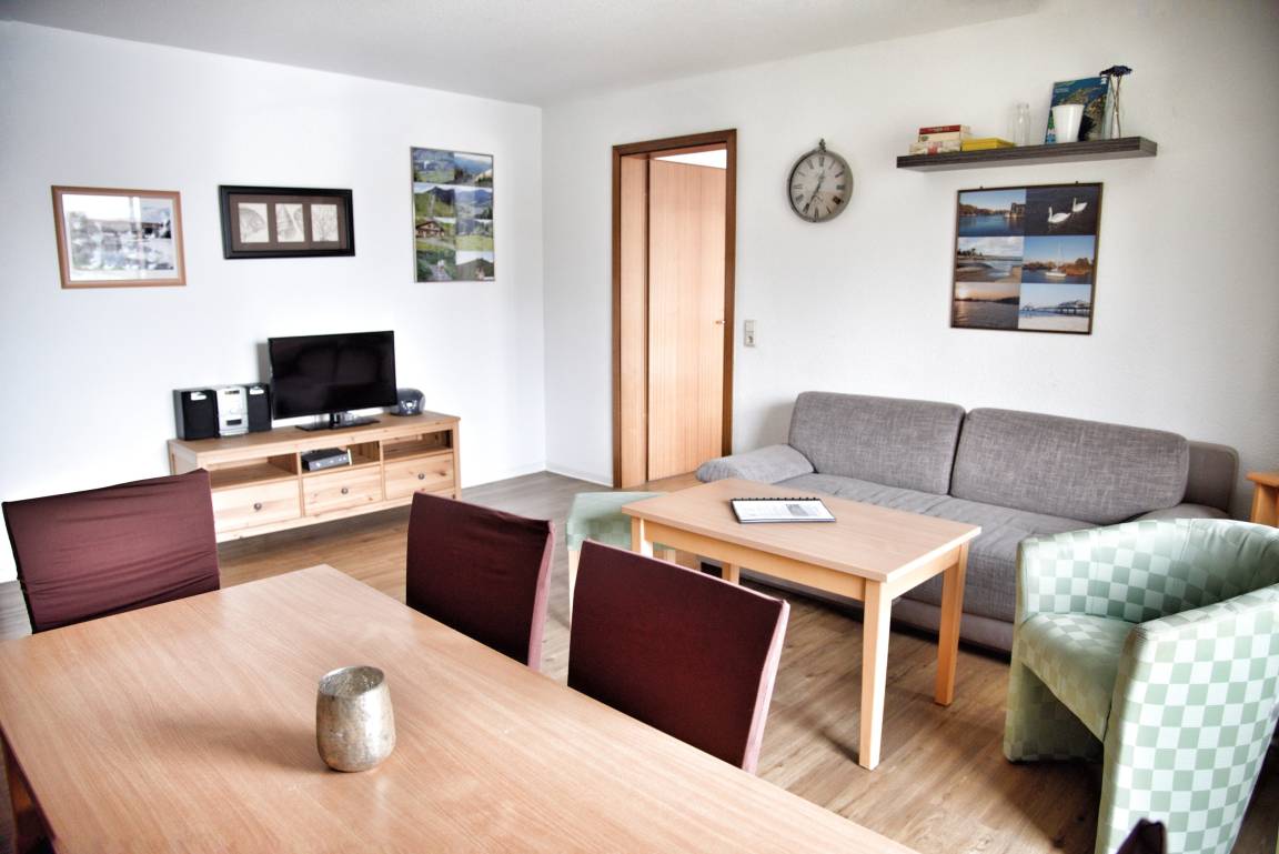 Ihr Wohnzimmer verfügt über einen Esstisch mit sechs Stühlen, ein ausziehbares Klappsofa mit einem Schlafplatz für zwei Personen und einem Sessel mit Fußhocker. Für die Übernachtungsgäste des Wohnzimmers steht Ihnen ein kleiner Schrank für Ihre Mitbringsel zur Verfügung. Multimedial wartet hier ein Flachbildfernseher auf Sie. Ihre Ferienwohnung hat einen Kabelanschluss. Auch einige Gesellschaftsspiele dürfen im Bestand nicht fehlen. Im großen und kleinen Schlafzimmer befinden sich ein Doppelbett. Nachtische, Leselampen und Garderoben möchten hier von Ihnen genutzt werden. Die Kleiderschränke werden Ihnen gute Dienste leisten.