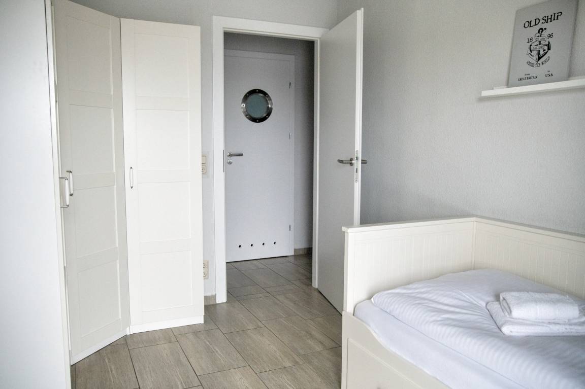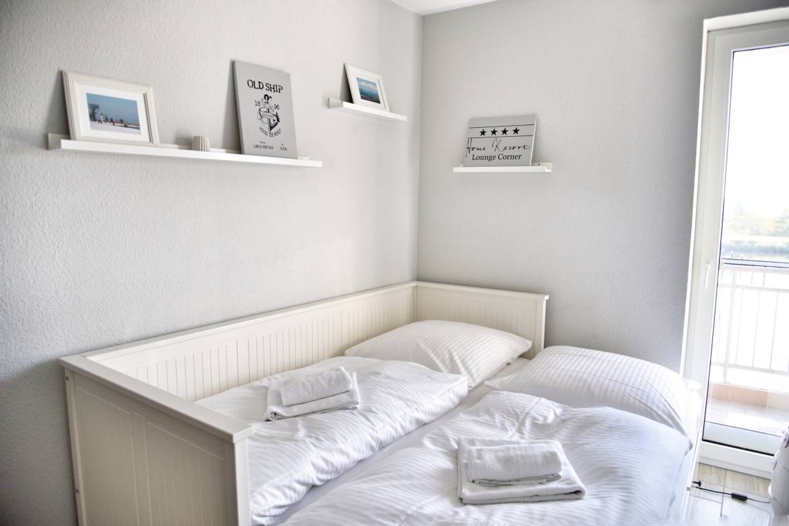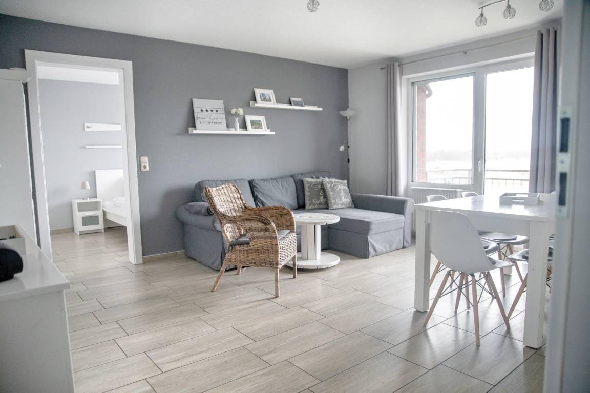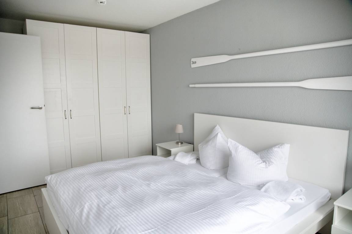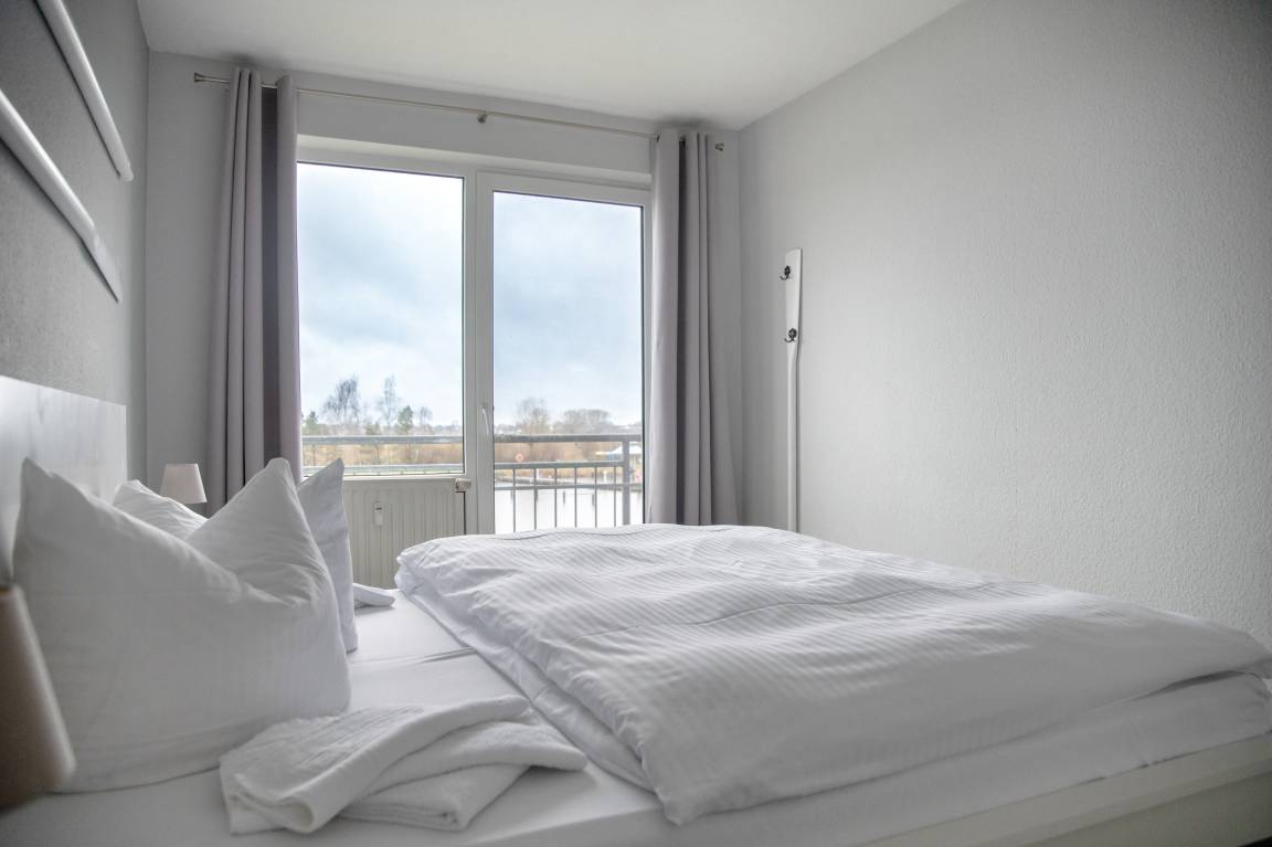 Bei der Ferienwohnung Ree! handelt es sich um eine hochwertig eingerichtete, maritim geprägte Nichtraucherwohnung, die sich auf 61 Quadratmeter erstreckt. Aus jedem Fenster und auch von den beiden südlich ausgerichteten Balkonen aus blicken Sie direkt auf die Hafenanlagen der Marina. Auf den beiden Balkonen stehen Ihnen Gartenstühle, ein Tisch und ein Sonnenschirm zur Verfügung. In den beiden Schlafzimmern und auch im Wohnzimmer sind die Fenster bodentief. So können Sie vom Bett aus die Boote im Hafenbecken fahren sehen.
