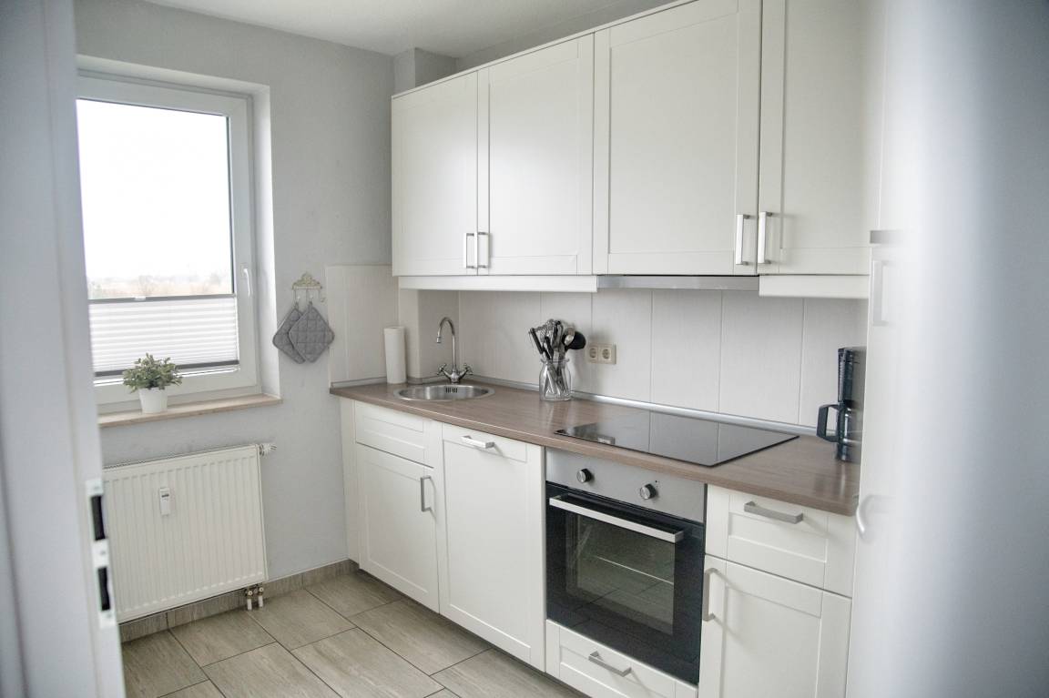 Ihre hochwertige Sterneküche ist für Sie voll ausgestattet. Bestandteile sind unter anderem ein Cerankochfeld, ein Backofen, eine Kaffeemaschine, eine Mikrowelle, viel Geschirr, ein Geschirrspüler, eine große Kühl- und Gefrierkombination und weiteres Equipment. Das Badezimmer hält eine Dusche mit Duschkabine, Ablageflächen und einen Fön für Sie bereit. Im Flur finden Sie eine Garderobe, einen großen Spiegel und Reinigungsgeräte vor.