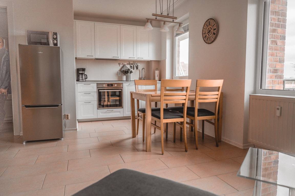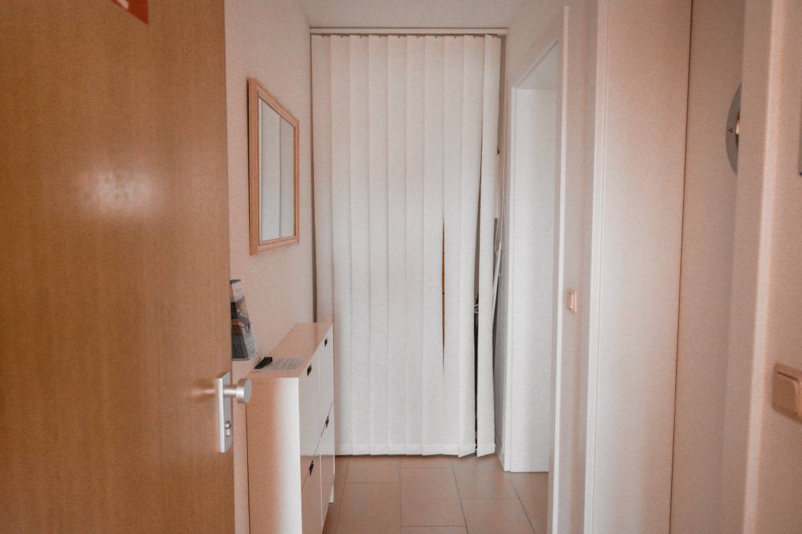 Ihre Küchenzeile ist zum Wohnzimmer hin offen, was den Raum großzügiger erscheinen lässt. In Ihrem offenen Wohn- und Essbereich steht Ihnen ein Esstisch mit vier Stühlen zur Verfügung. Die Küchenzeile ist sehr gut ausgestattet. Bestandteile sind unter anderem ein Cerankochfeld mit Backofen, eine Mikrowelle, eine Kaffeemaschine, viel Geschirr sowie ein Kühlschrank mit Gefrierfach. Das Badezimmer hat eine Dusche mit Duschkabine, einen Spiegelschrank, natürlich haben Sie auch hier einen Fön und Ablageflächen. Ihr Flur beherbergt eine Flurgarderobe, eine Schuhablage und einen Wandspiegel.