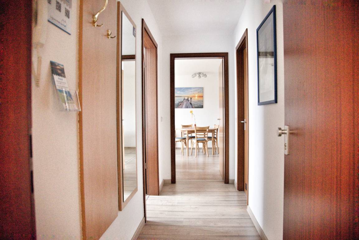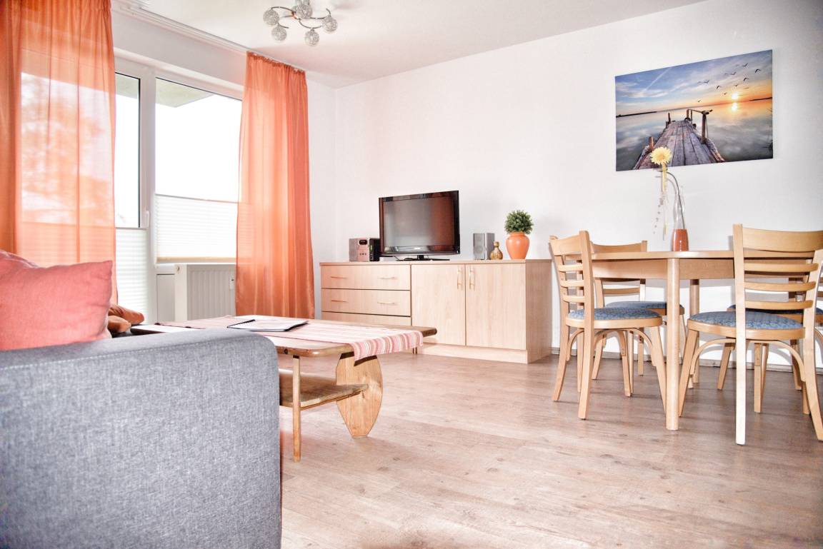 Ihr lichtdurchflutetes Wohnzimmer verfügt über einen Esstisch mit vier Stühlen, ein ausziehbares Schlafsofa mit einem Schlafplatz für zwei Personen und zwei Sessel. Die Wohnküche ist zum Wohnzimmer hin offen, was den Raum noch weitläufiger erscheinen lässt. Multimedial steht Ihnen hier ein großer Flachbildfernseher mit Kabel-TV zur Verfügung. Auch einige Gesellschaftsspiele dürfen im Bestand nicht fehlen. Im Schlafzimmer befinden sich ein komfortables Doppelbett sowie ein großzügig bemessener Kleiderschrank. Hier können Sie Ihre Koffer bequem auspacken. Ihre Küchenzeile ist voll ausgestattet. Bestandteile sind unter anderem ein Kochfeld, eine Kaffeemaschine, eine Mikrowelle, ein Backofen, viel Geschirr sowie einen Kühlschrank mit Gefrierfach. Hier können Sie sich kulinarisch voll entfalten. Ihr Badezimmer hat eine Dusche mit Duschkabine und Ablageflächen. Ihre mitgebrachten Utensilien werden Sie hier gut verstauen können. In Ihrem Flur finden Sie eine Garderobe und einen großen Spiegel vor. Das Appartement Muschel liegt im Erdgeschoß des Hauses Regatta, im Eingang 3. In unmittelbarer Nähe dieses Appartements befinden sich weiter Ferienappartements unserer Gesellschaft. Eine gemeinsame Anmietung ist hier sehr gut möglich.