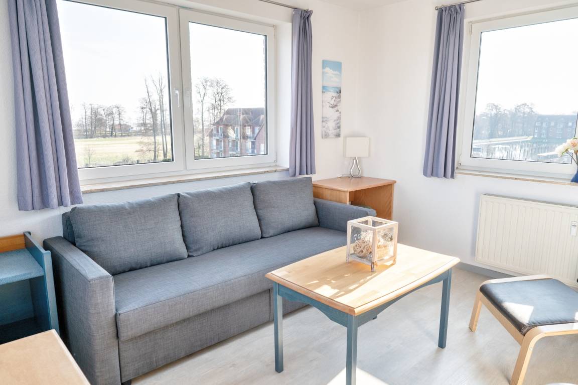 Die Ferienwohnung ist für eine Zweizimmerwohnung sehr großzügig geschnitten. Ein kleines, zusätzliches Türmchenzimmer verleiht der Wohnung nicht nur einen besonderen Charme, sondern auch einen wunderbaren Ausblick .Das Wohnzimmer verfügt über einen Esstisch mit vier Stühlen, ein ausziehbares Schlafsofa mit einem Schlafplatz für zwei Personen und einem Sessel mit Hocker. Multimedial können Sie auf einen großen Flachbildfernseher zurückgreifen. Ihre Ferienwohnung hat einen Kabelanschluss. Auch einige Gesellschaftsspiele warten hier schon auf Sie. Zusätzlich zum Wohnzimmer befindet sich ein durch eine Treppe erreichbares Türmchenzimmer. Dieses Zimmer hält eine ausklappbare Couch, einen Sessel mit Hocker und einen Tisch mit zwei Stühlen bereit. Für die Schlafgäste steht ein Kleiderschrank zur Verfügung. In Ihrem Schlafzimmer befindet sich ein Doppelbett. Nachttische, Leselampen und Garderoben möchten hier von Ihnen genutzt werden. Der große Schrank und das Kofferbord werden Ihnen gute Dienste leisten und genügend Stauraum für Ihr Gepäck bieten. Die Wohnküche ist zum Wohnzimmer hin offen, was den Raum großzügig erscheinen lässt. Ihre Küche ist für Sie voll ausgestattet. Bestandteile sind unter anderem ein Kochfeld, eine Kaffeemaschine, ein Backofen, viel Geschirr, ein Geschirrspüler sowie eine Kühl- und Gefrierkombination. Das Badezimmer ist mit einer hohen Duschkabine und ausreichend Ablageflächen ausgestattet. Auch ein Fön wartet hier schon auf Sie. Vom Flur, wo Sie auch eine Garderobe und einen großen Spiegel vorfinden, gehen alle Räume ab. Die Ferienwohnung Back befindet sich im zweiten Obergeschoss des Hauses Störtebeker im Eingang 1. In unmittelbarer Nähe dieser Ferienwohnung befinden sich weitere Appartements unserer Gesellschaft .Eine gemeinsame Anmietung ist hier sehr gut möglich.