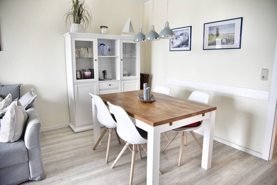 Ihr Wohnzimmer verfügt über einen Esstisch mit vier Stühlen, ein ausziehbares Ecksofa mit einem Schlafplatz für zwei Personen und einen Sessel. Multimedial steht Ihnen ein großer Flachbildfernseher zur Verfügung. Die Ferienwohnung verfügt über einen Kabelanschluss.