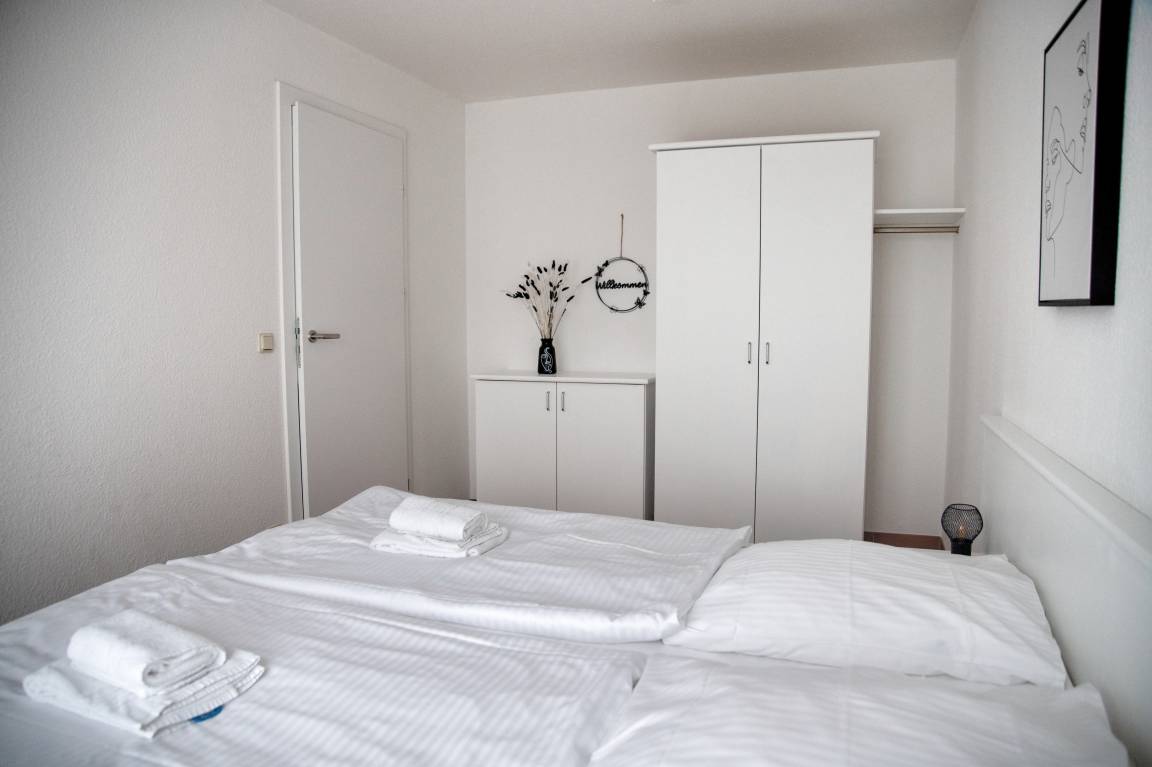 Das Wohnzimmer verfügt über einen Esstisch mit vier Stühlen, ein ausziehbares Schlafsofa mit einem Schlafplatz für zwei Personen und einen Sessel. Multimedial steht Ihnen hier ein Flachbildfernseher zur Verfügung. Ihre Ferienwohnung hat einen Kabelanschluss. Auch einige Gesellschaftsspiele dürfen hier im Bestand nicht fehlen. In Ihrem Schlafzimmer befindet sich ein Doppelbett. Nachtische und Leselampen möchten hier von Ihnen genutzt werden. Der Schrank wird Ihnen gute Dienste leisten und genügend Stauraum für Ihr Gepäck bieten. Die Küche ist zum Wohnzimmer hin offen, was den Raum noch großzügiger erscheinen lässt. Ihre Küchenzeile ist voll ausgestattet. Bestandteile sind unter anderem ein Kochfeld, eine Kaffeemaschine, viel Geschirr, ein Geschirrspüler, einen Backofen eine Mikrowelle sowie eine Kühl- und Gefrierkombination. Kulinarisch sind hier also keine Grenzen gesetzt. Ihr Badezimmer ist mit einer ebenerdigen Duschkabine und ausreichend Ablageflächen ausgestattet. Ihr Flur beherbergt eine Garderobe und einen großen Spiegel für Sie. Das Appartement Kai liegt im Erdgeschoß des Hauses Wikinger, im Eingang 2. In unmittelbarer Nähe dieses Appartements befinden sich weitere Ferienappartements unserer Gesellschaft. Eine gemeinsame Anmietung ist hier sehr gut möglich.