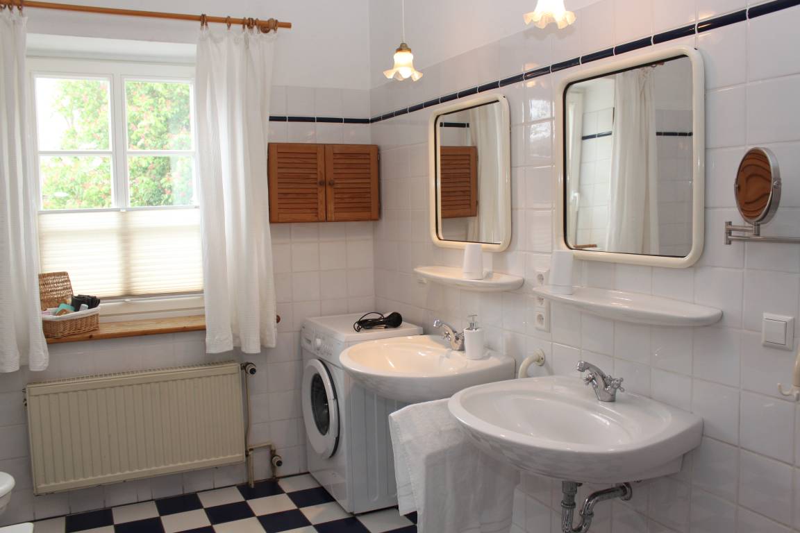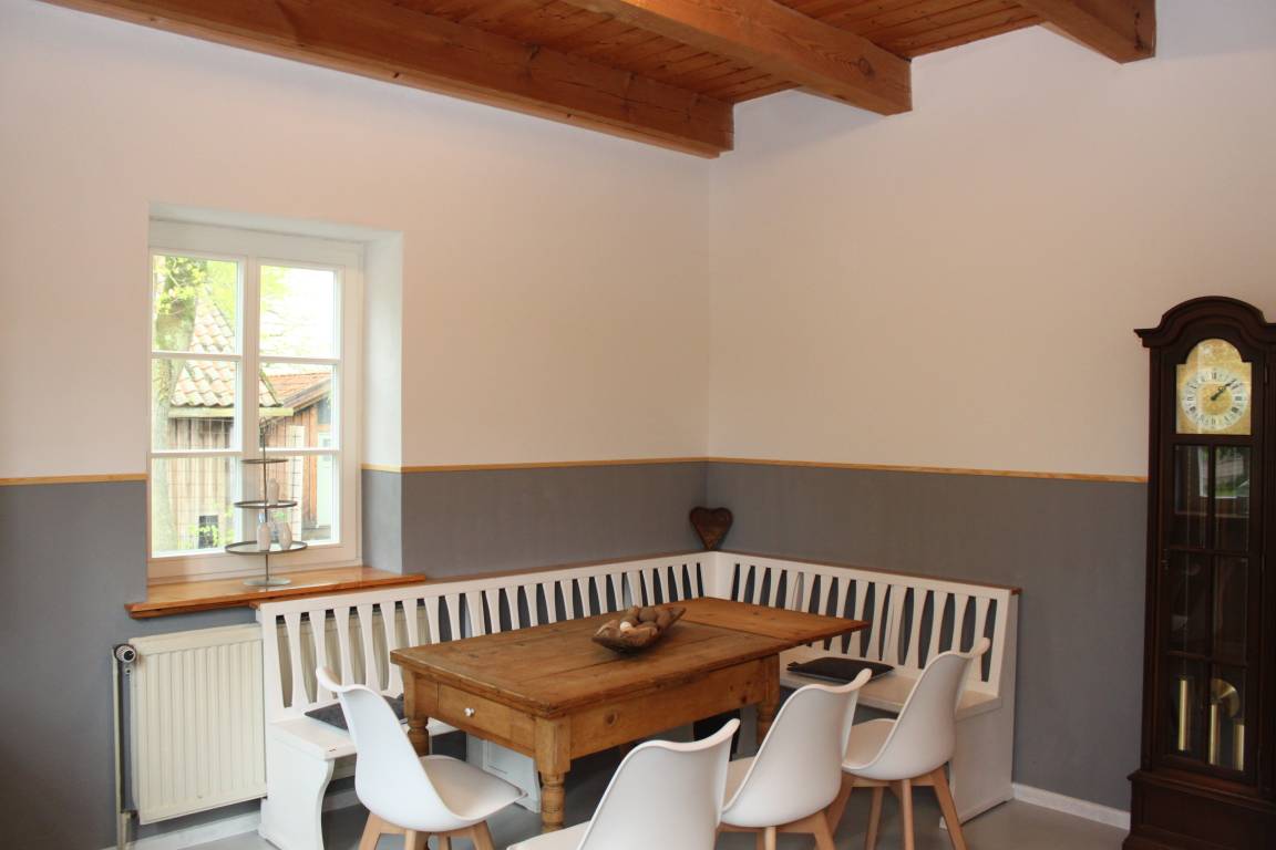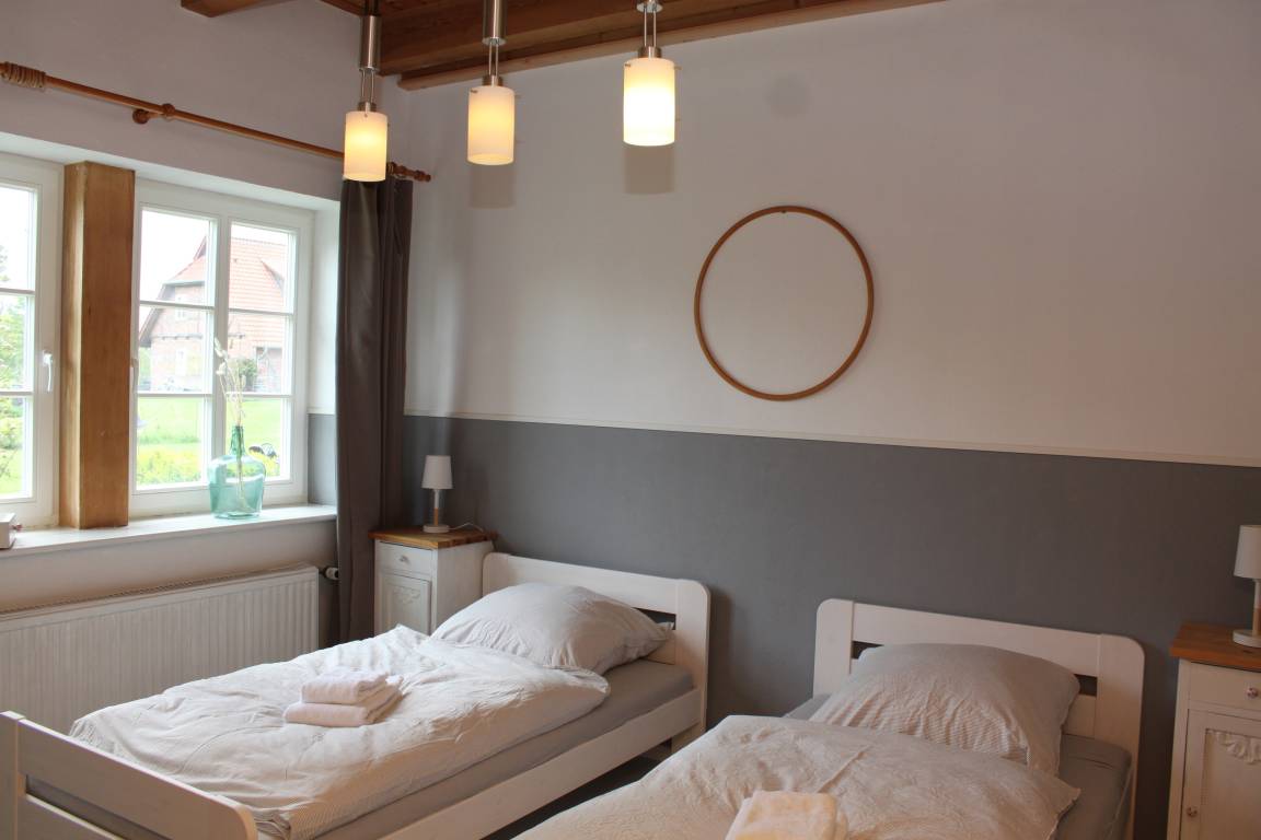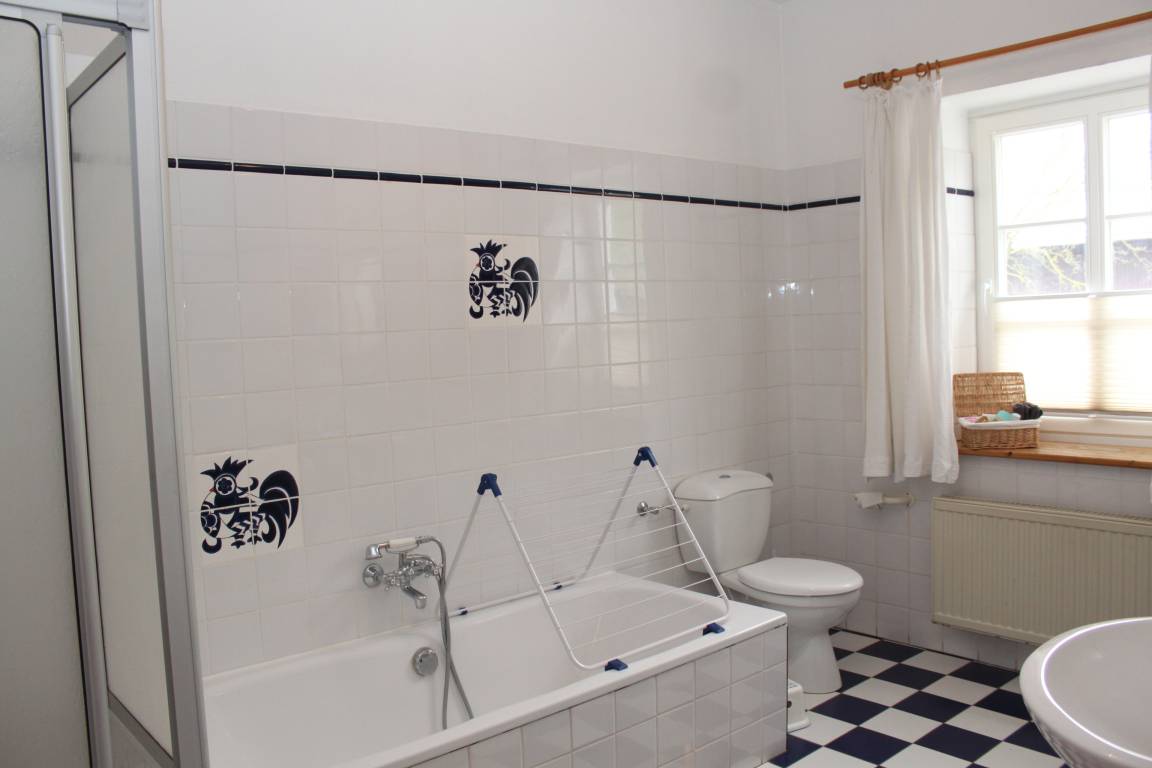Auf rund 70m² bietet die schöne Ferienwohnung in einem stilvollen Fachwerkhaus Platz für bis zu sechs Personen - ideal für Familien mit bis zu vier Kindern. Über einen separaten Eingang gelangen Sie direkt in den kleinen gemütlichen Wohnbereich mit Sofa und TV. Die Schlafzimmer sind über einen kleinen Flur erreichbar. Eines ist mit zwei Einzelbetten (auch als Doppelbett zu stellen) ausgestattet. Das zweite Schlafzimmer verfügt über ein Etagenbett und bis zu zwei weitere Einzelbetten. Dazwischen liegt ein kleines Bad mit Dusche/WC. Die großzügige Küche ist voll ausgestattet. Am großen Esstisch mit Eckbank findet die ganze Familie Platz. Neben der Küche befindet sich ein weiteres großes Bad mit Dusche und Badewanne sowie einer Waschmaschine.