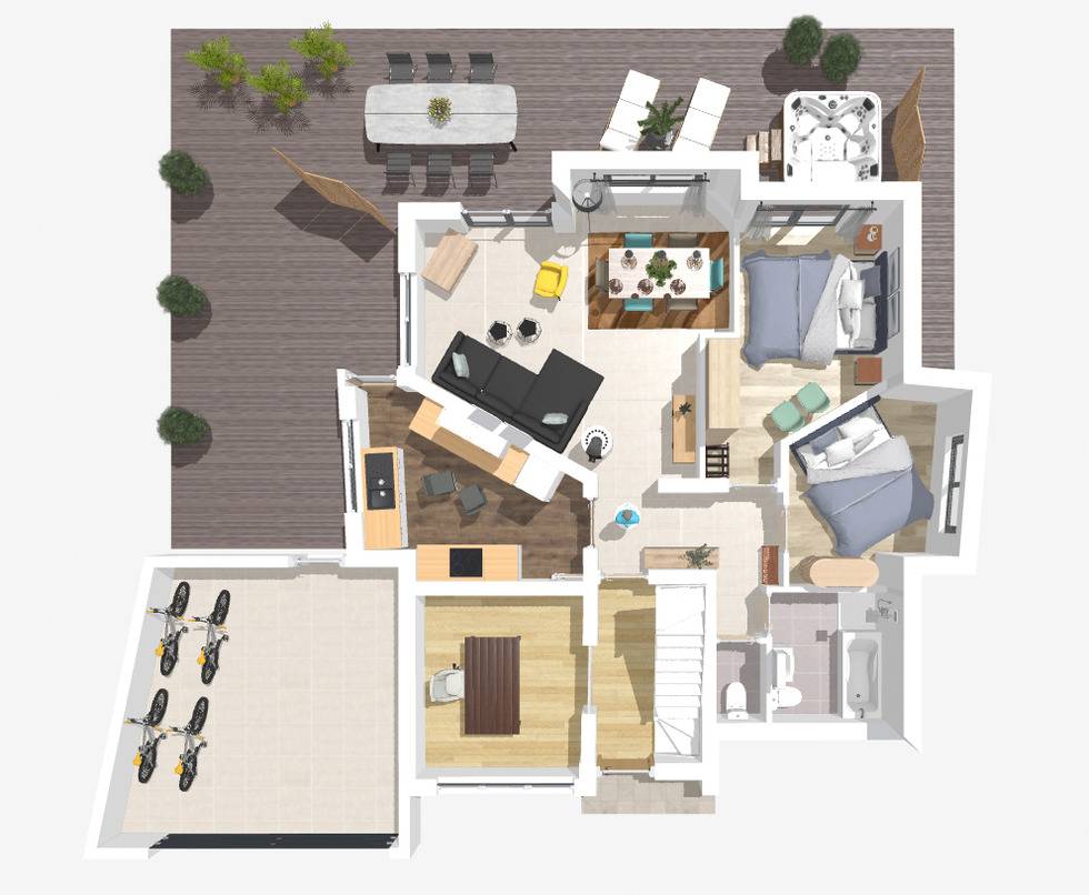 Die XXL-Terrasse mit Whirlpool ist das Highlight dieses Apartments! Genieße ein entspanntes Bad unter freiem Himmel, spüre die Sonne auf der Haut und erlebe unvergessliche Momente im Freien.