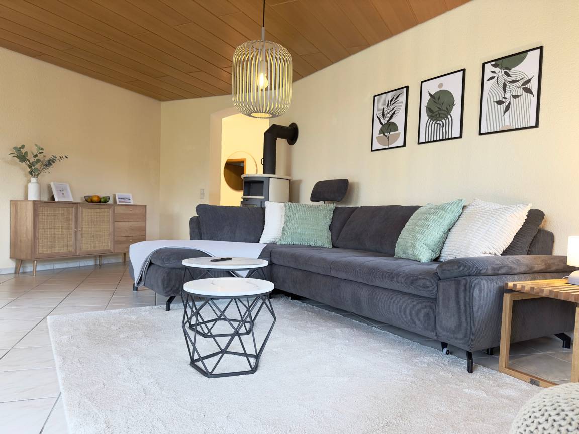 Das stilvolle Wohnzimmer verbindet sich harmonisch mit dem Essbereich und bietet Zugang zur beeindruckenden Terrasse. Das ausziehbare Schlafsofa (1,40 m Breite) schafft zusätzliche Schlafmöglichkeiten und sorgt für ein komfortables Wohnambiente.