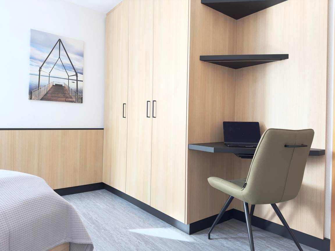 Erlebe höchsten Wohnkomfort in diesem stilvollen Apartment, das keine Wünsche offenlässt! Das großzügige Schlafzimmer verwöhnt dich mit einem 1,80 m Komfort-Doppelbett, einem Smart-TV sowie einem praktischen Schreibtisch – ideal für entspannte Nächte und produktives Arbeiten. Der direkte Zugang zum Balkon lädt dich ein, frische Luft zu genießen und den Tag entspannt ausklingen zu lassen.