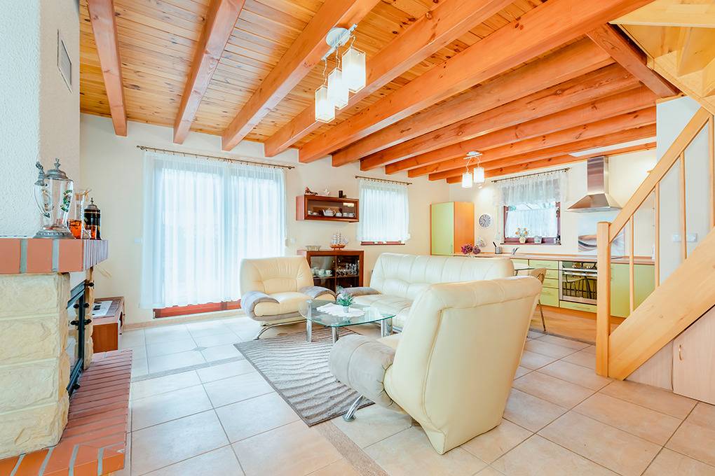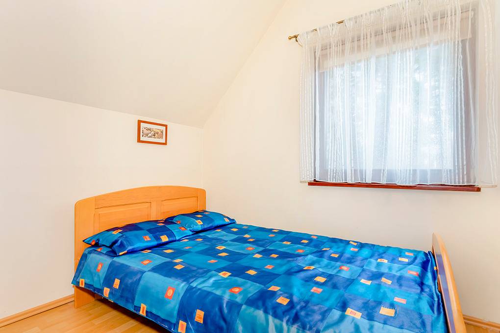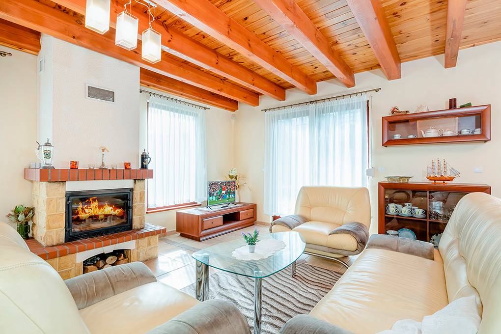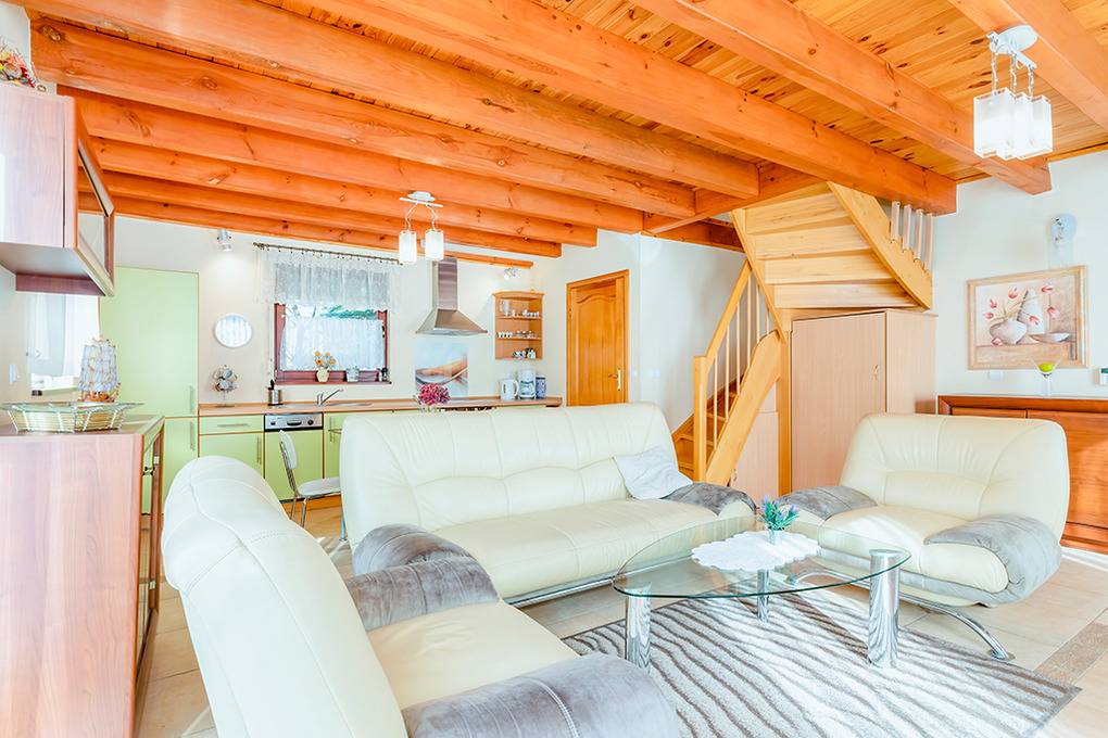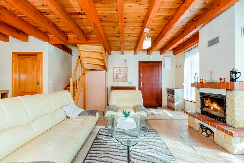 PL 36.16 Ferienhaus 2-6 Pers.: Niveauvolles 4-Zimmerhaus mit ca. 80 qm Wohnfläche über 2 Etagen. Parterre: Schöner, großzügiger Wohn-/Essraum mit rustikaler Holzbalkendecke, Kamin, Sofa, Sat-TV (deutsche Programme), Esstisch, moderner, gut ausgestatteter Einbauküche (E-Herd 4 Pl., Abzugshaube, Mikrowelle, Backofen, Tiefkühlruhe 30 l, Spülmaschine). Abstellkammer mit Waschmaschine. Bad: Bw, Wb, WC. 1. Etage: 3 Doppelzimmer (eines mit Ausziehsofa). Bad: Du, Wb, WC.