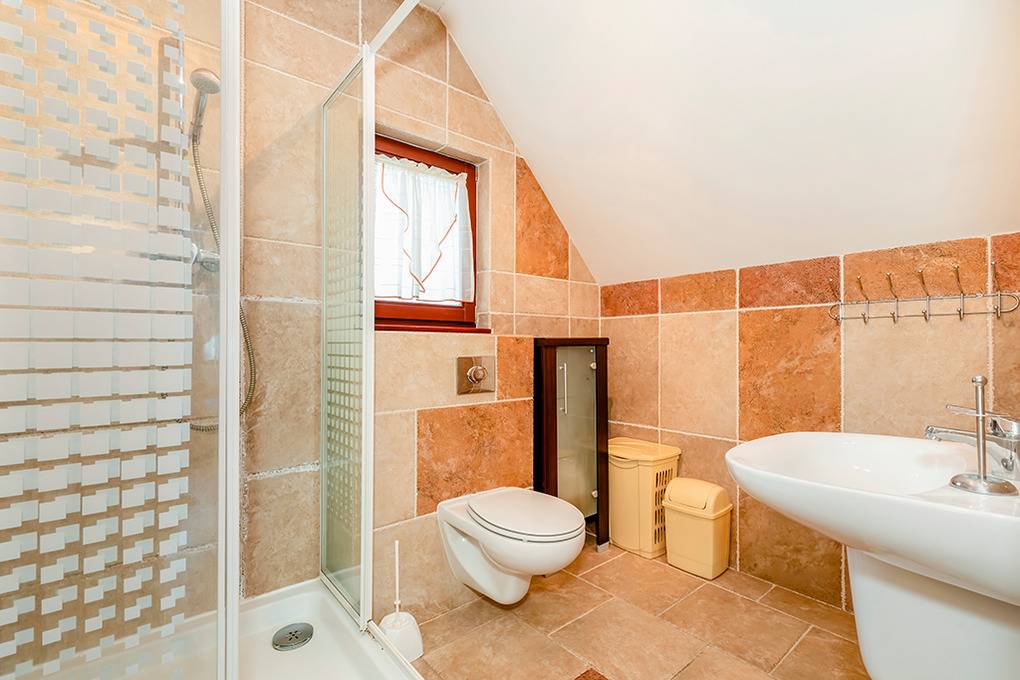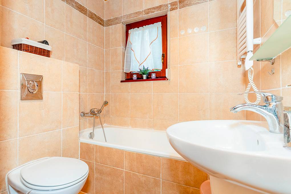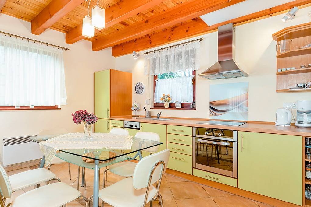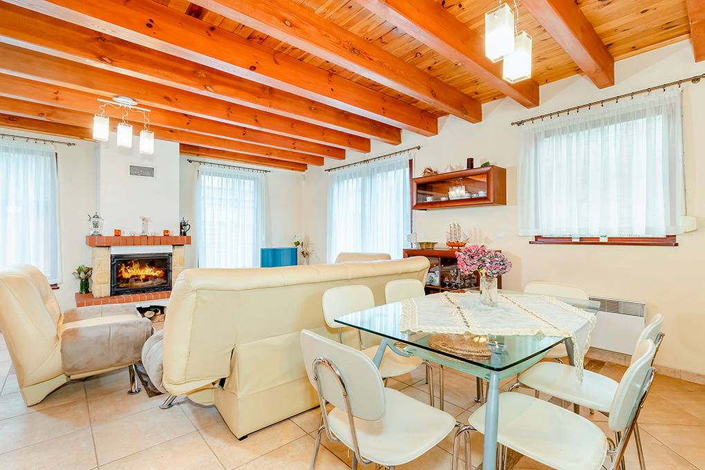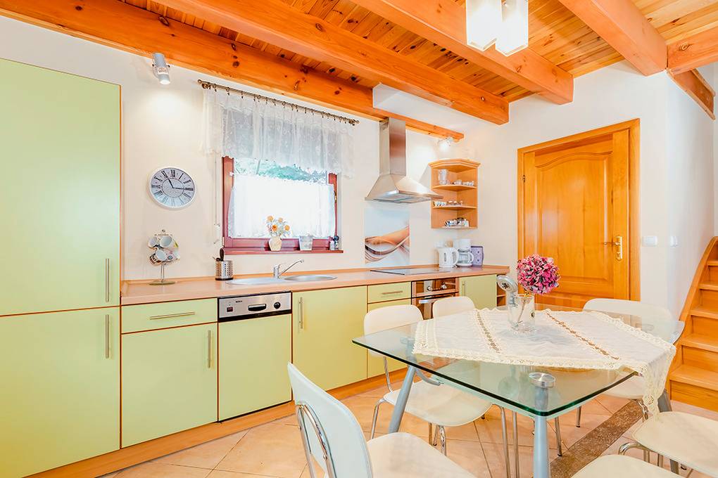 PL 36.16 Ferienhaus 2-6 Pers.: Niveauvolles 4-Zimmerhaus mit ca. 80 qm Wohnfläche über 2 Etagen. Parterre: Schöner, großzügiger Wohn-/Essraum mit rustikaler Holzbalkendecke, Kamin, Sofa, Sat-TV (deutsche Programme), Esstisch, moderner, gut ausgestatteter Einbauküche (E-Herd 4 Pl., Abzugshaube, Mikrowelle, Backofen, Tiefkühlruhe 30 l, Spülmaschine). Abstellkammer mit Waschmaschine. Bad: Bw, Wb, WC. 1. Etage: 3 Doppelzimmer (eines mit Ausziehsofa). Bad: Du, Wb, WC.
