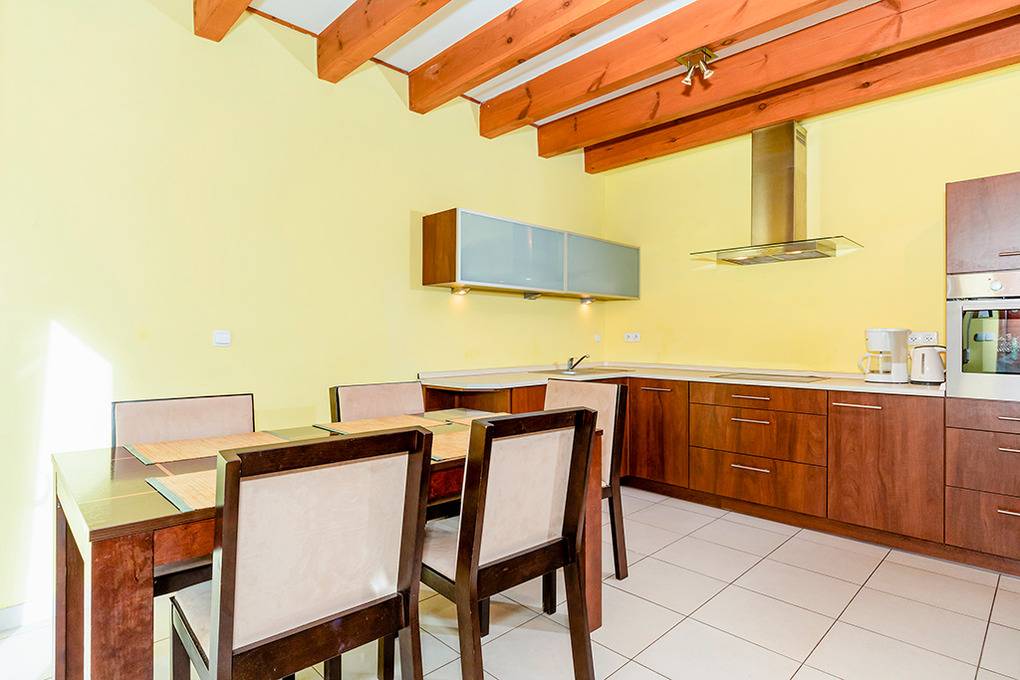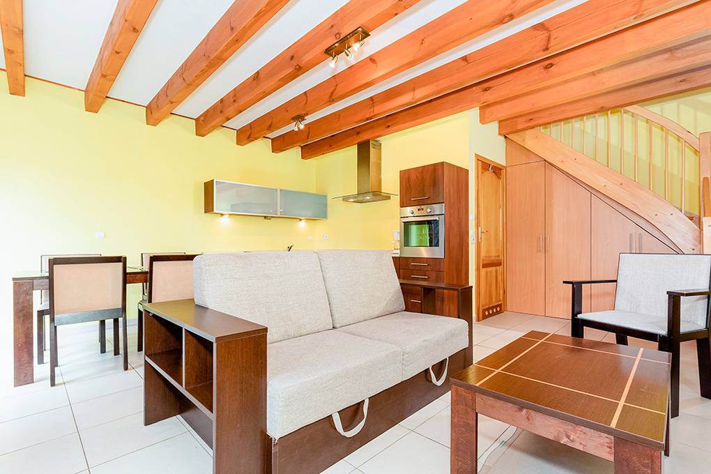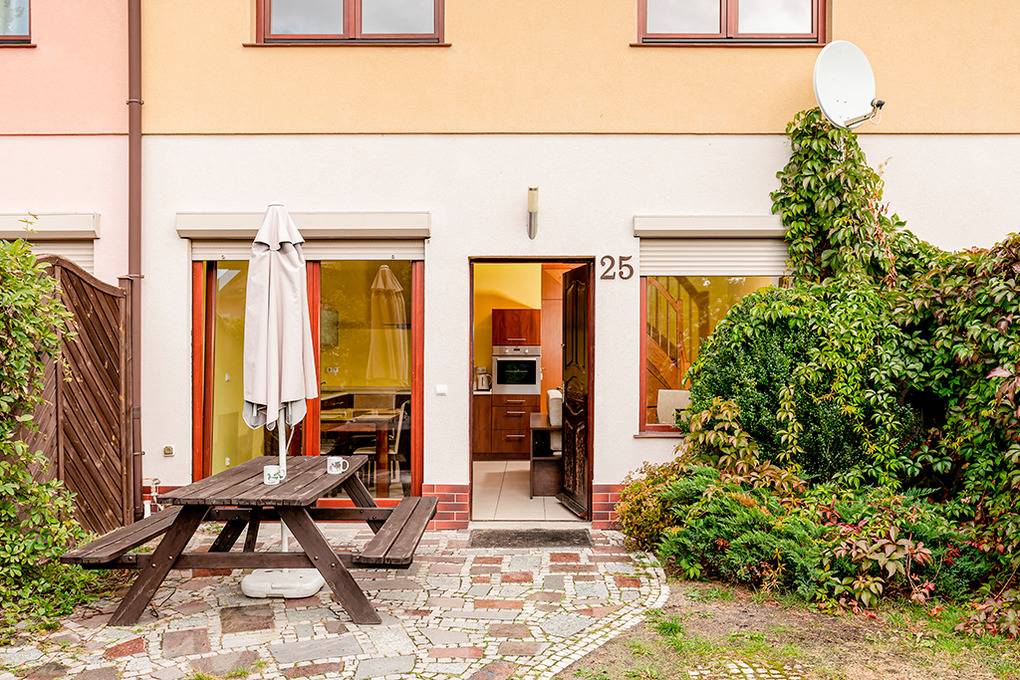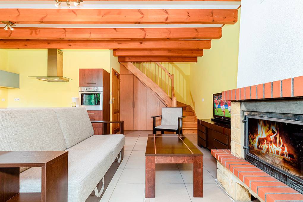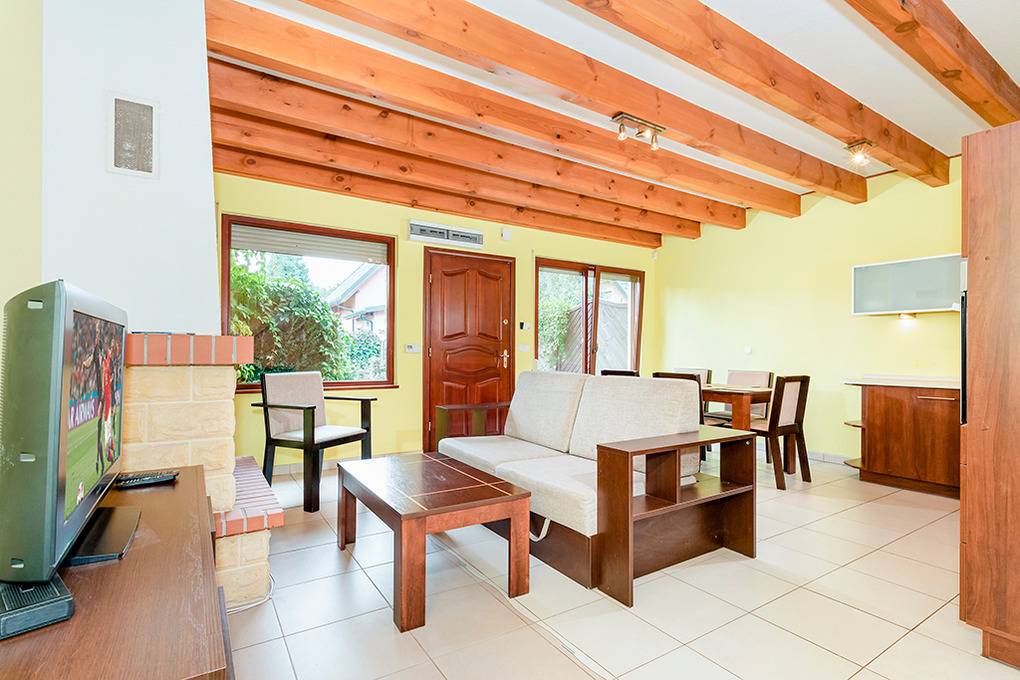 Haus: Komfortables Reihenhaus mit Kamin. Rustikaler Flair durch Holzbalkendecke im Wohnraum. Gemütliche Einrichtung. Großes Platzangebot: 2 Schlafzimmer, 2 Bäder. E-Heizung, teils Fußbodenheizung. Warmwasser über E-Boiler (75 l). Terrasse mit Sitzmöbeln. 1 Pkw-Parkplatz auf dem Grundstück. Die Anlage ist rund um die Uhr bewacht.