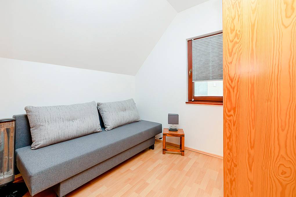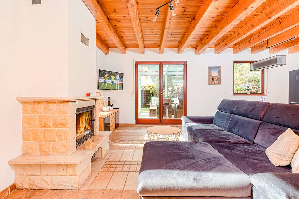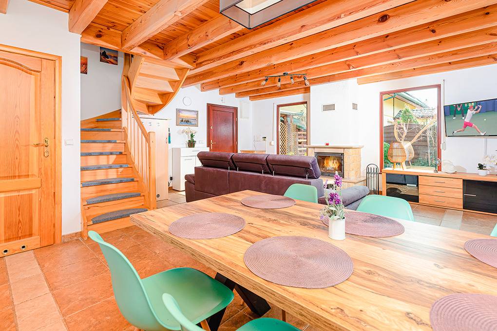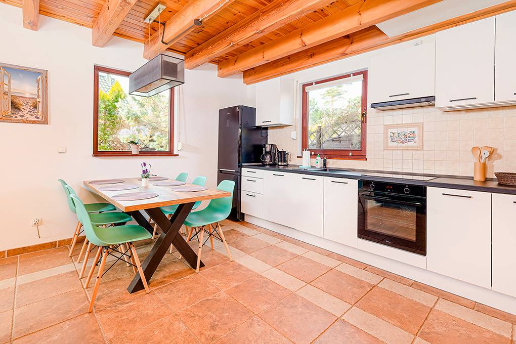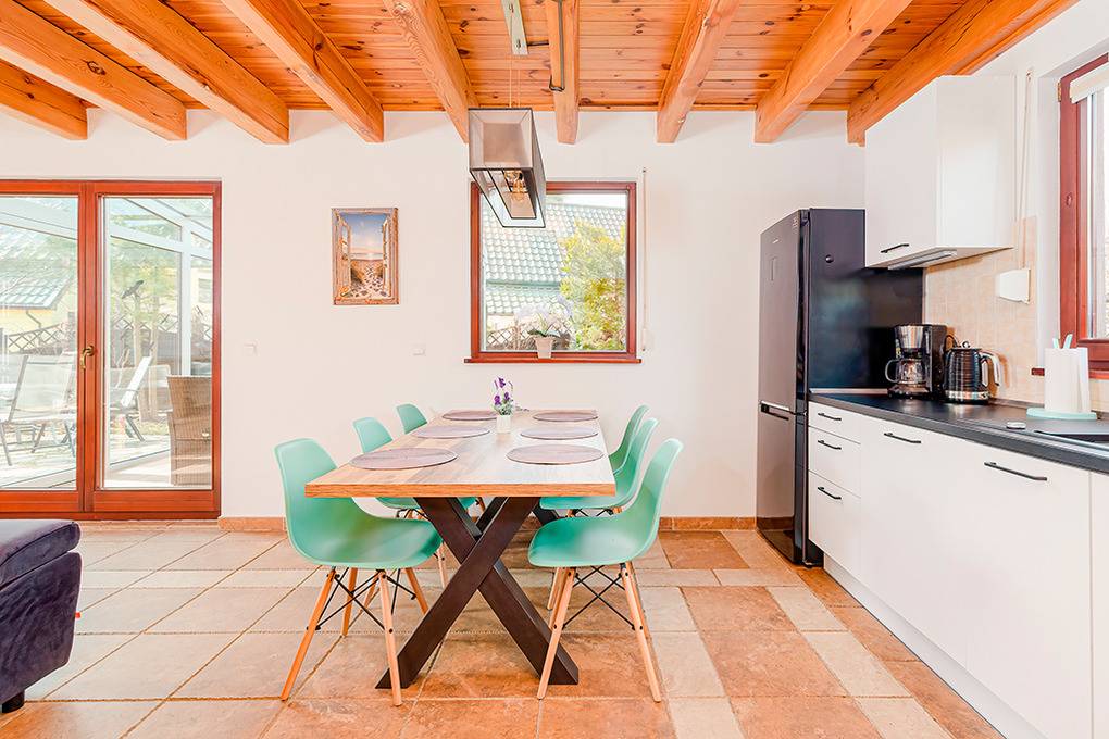 PL 36.2 Ferienhaus 2-6 Pers.: Niveauvolles 4-Zimmerhaus mit ca. 75 qm Wohnfläche über 2 Etagen. Parterre: Schöner, großzügiger Wohn-/Essraum mit rustikaler Holzbalkendecke, Kamin, Sofa, Sat-TV (deutsche Programme, Netflix, Amazon Prime), Esstisch, moderner, gut ausgestatteter Einbauküche (Ceranfeld 4 Pl., Abzugshaube, Backofen, Tiefkühlschrank 100 l, Spülmaschine). Schöner Wintergarten mit Gartenblick. Abstellkammer mit Waschmaschine. Bad: Bw, Wb, WC. 1. Etage: 2 Doppelzimmer. 2-Bettzimmer mit Schlafsofa. Bad: Du, Wb, WC, Trockner.