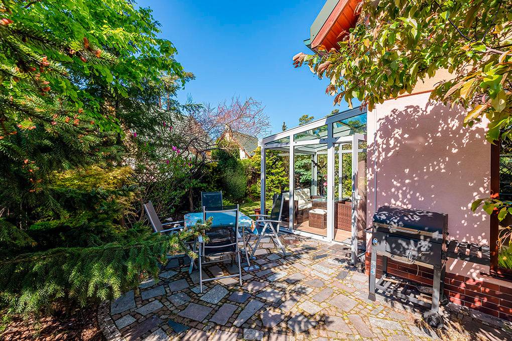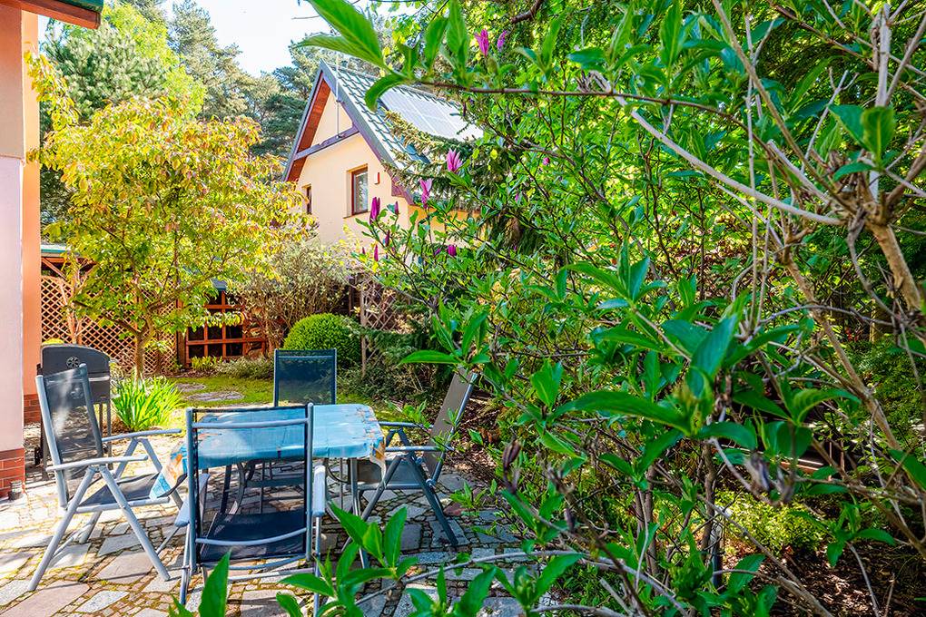 Haus: Geschmackvolles, komfortables Ferienhaus mit Kamin und Wintergarten. 3 Schlafzimmer, 2 Bäder. Niveauvolle, hochwertige Einrichtung. Kostenloses Internet über WLan. TV mit Netflix, Amazon Prime Streamingdienst. Schöner Wintergarten mit Gartenblick. Heizung durch Klima-Anlage (heizen + kühlen), Warmwasser über E-Boiler (75 l). Terrasse mit Sitzmöbeln, anschließend gepflegter Garten mit Rasenfläche. Carport mit 2 Pkw-Stellplätzen auf umzäuntem Grundstück. Die Ferienhausanlage ist rund um die Uhr bewacht.