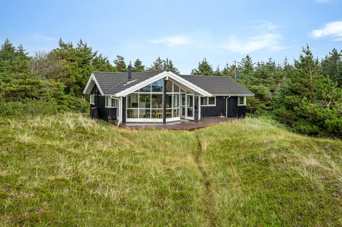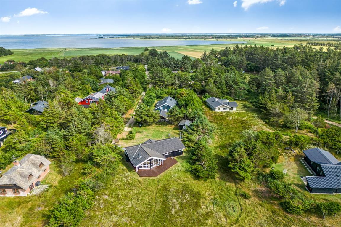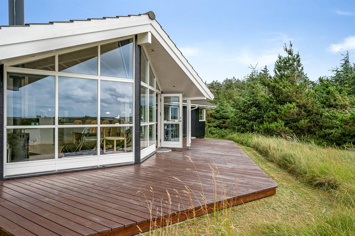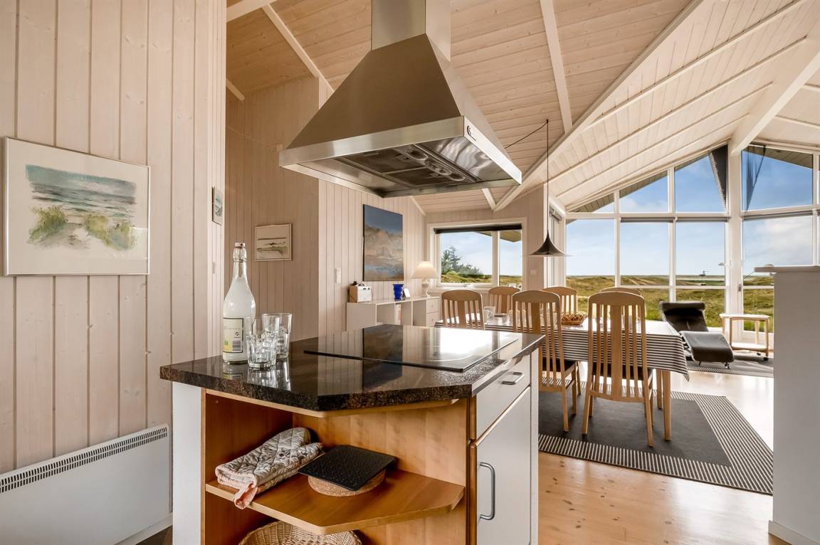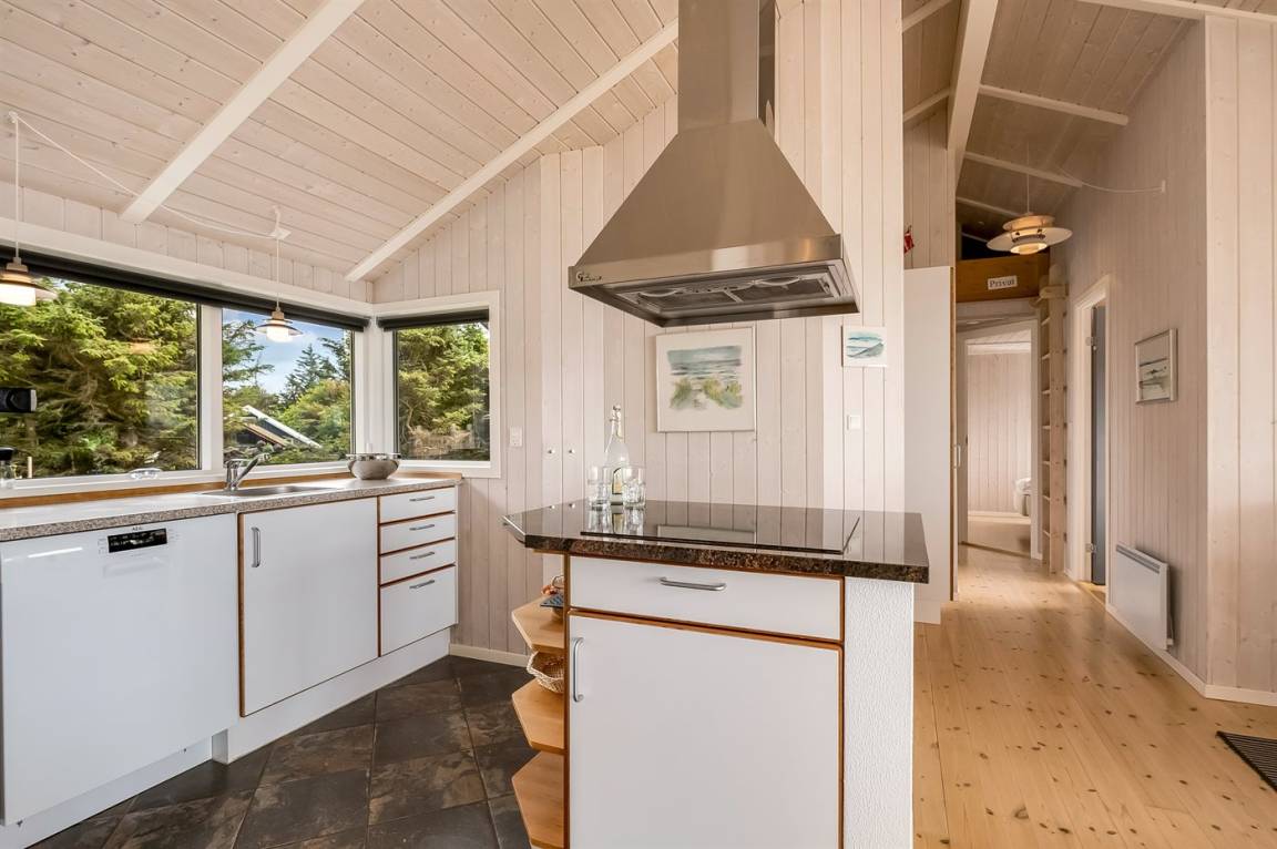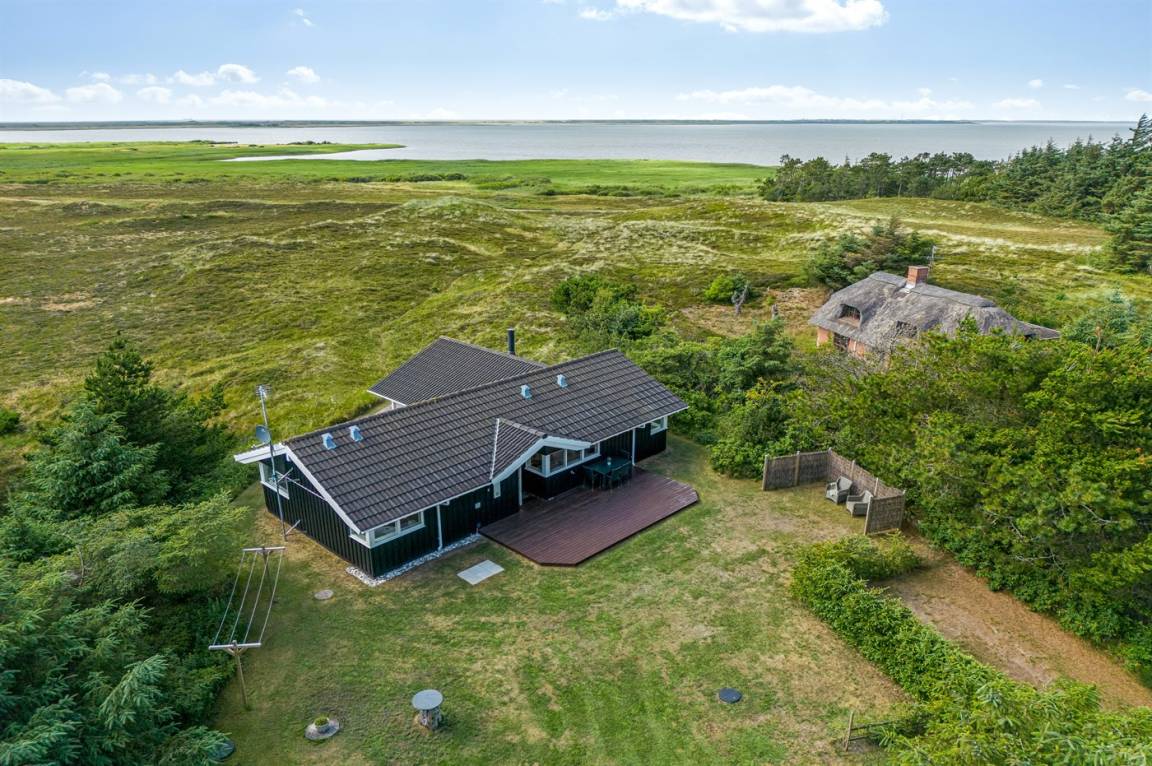 Herrliches Ferienhaus aus Holz, 2003 gebaut, auf einem Natur-/Dünengrundstück am Ende einer Straße gelegen. Vom Wohnzimmer aus Aussicht auf den Fjord und auf die Dünenlandschaft. Schönes Terrassenareal mit Gartenmöbeln. Das Haus ist geschmackvoll und mit neuen Möbeln eingerichtet. Die Wände und Decken sind mit Holz verkleidet. Ebenfalls Holzböden, jedoch beheizbarer Klinkerboden im Badezimmer und in der Küche. Nettes Badezimmer mit Duschnische, 2-Pers.-Whirlpool und direktem Zugang zur Sauna des Hauses. Schöne Küche mit u. a. Geschirrspüler, Mikrowelle, Umluftofen und Herd mit Ceran-Feld. Das Wohnzimmer enthält Kaminofen, Radio, TV mit digitalem Satellitenanschluss und DVD-Spieler. Die 6 Schlafplätze verteilen sich auf 3 Schlafzimmer; 2 mit Doppelbett und 1 mit 2 Einzelbetten. Ferner stehen Waschmaschine, Wäschetrockner und Kinderhochstuhl zur Verfügung.