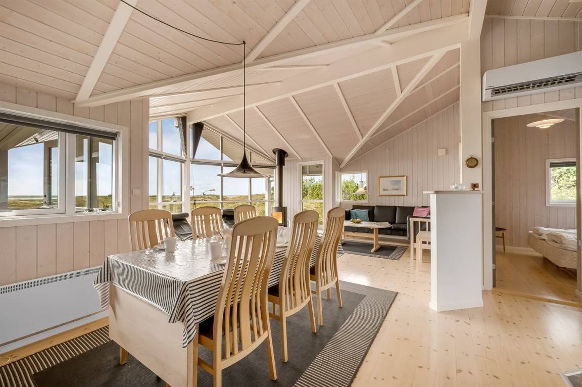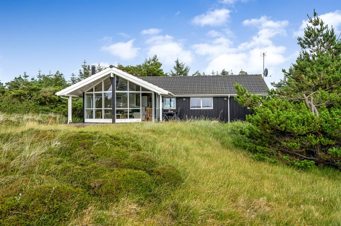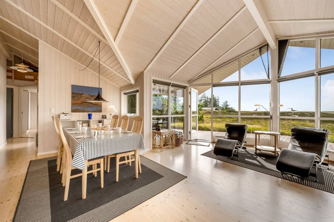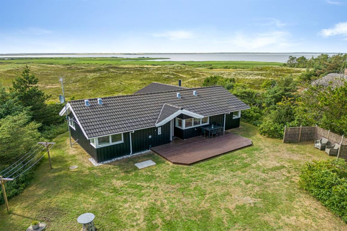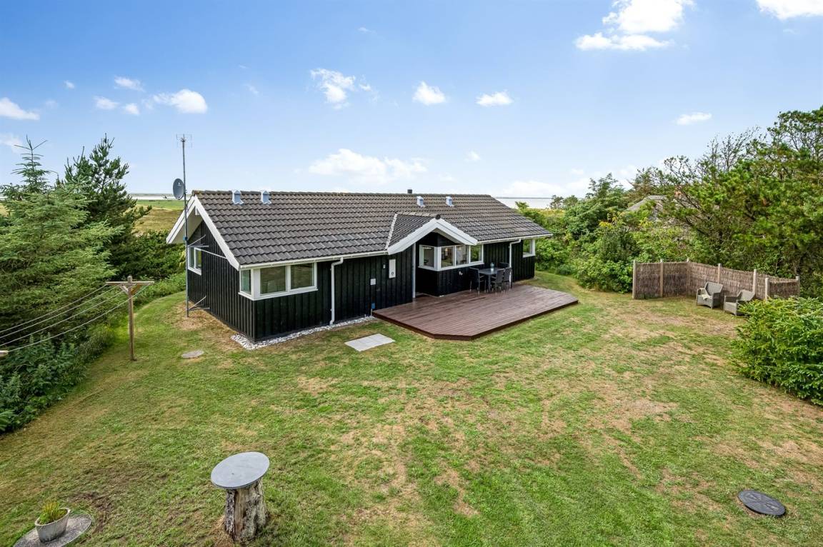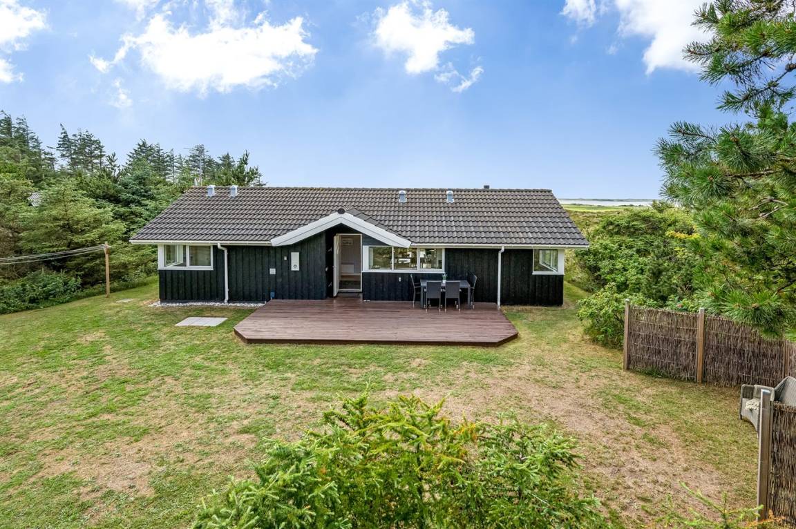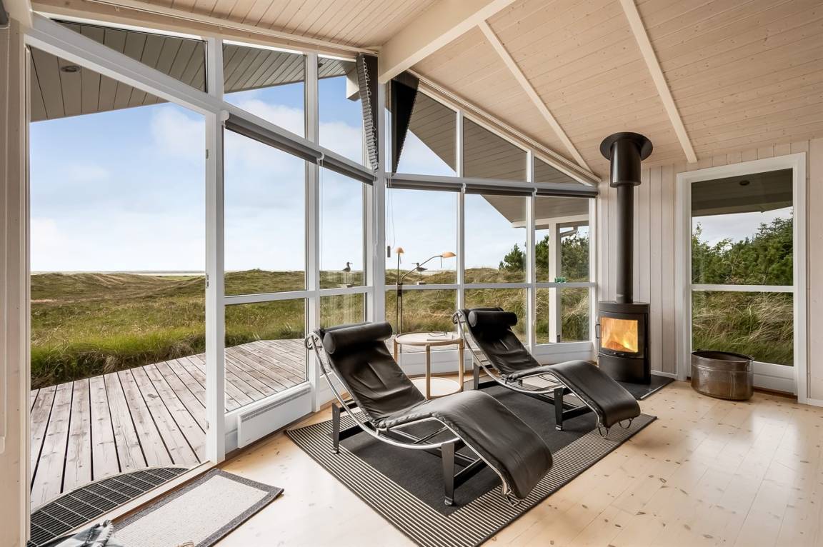 Herrliches Ferienhaus aus Holz, 2003 gebaut, auf einem Natur-/Dünengrundstück am Ende einer Straße gelegen. Vom Wohnzimmer aus Aussicht auf den Fjord und auf die Dünenlandschaft. Schönes Terrassenareal mit Gartenmöbeln. Das Haus ist geschmackvoll und mit neuen Möbeln eingerichtet. Die Wände und Decken sind mit Holz verkleidet. Ebenfalls Holzböden, jedoch beheizbarer Klinkerboden im Badezimmer und in der Küche. Nettes Badezimmer mit Duschnische, 2-Pers.-Whirlpool und direktem Zugang zur Sauna des Hauses. Schöne Küche mit u. a. Geschirrspüler, Mikrowelle, Umluftofen und Herd mit Ceran-Feld. Das Wohnzimmer enthält Kaminofen, Radio, TV mit digitalem Satellitenanschluss und DVD-Spieler. Die 6 Schlafplätze verteilen sich auf 3 Schlafzimmer; 2 mit Doppelbett und 1 mit 2 Einzelbetten. Ferner stehen Waschmaschine, Wäschetrockner und Kinderhochstuhl zur Verfügung.