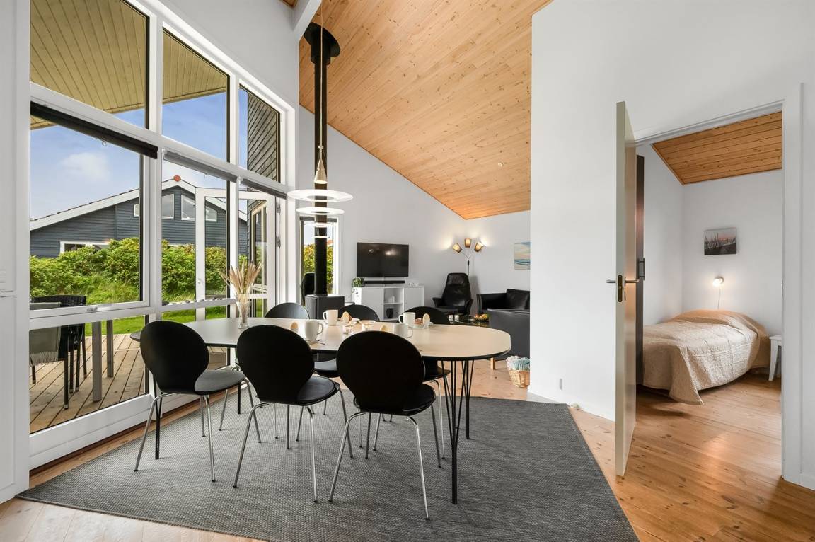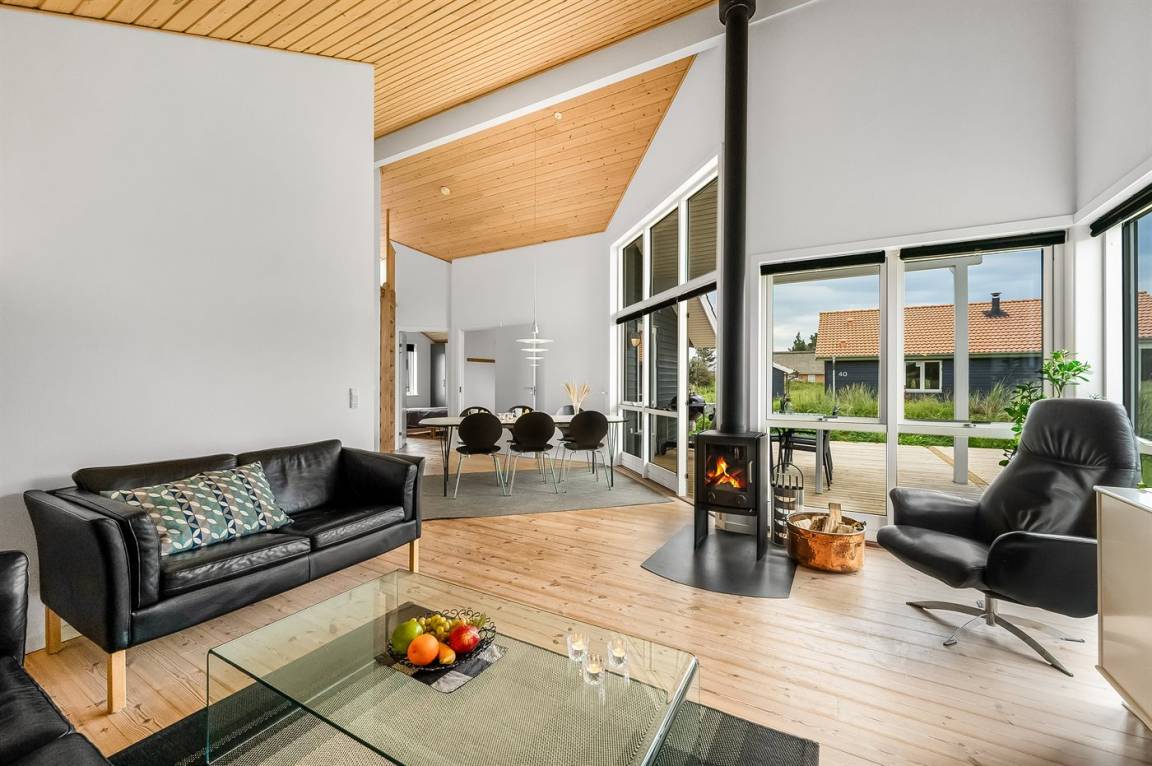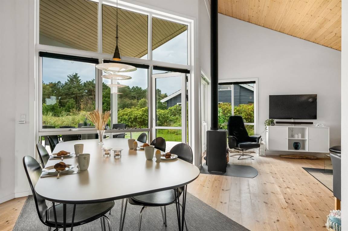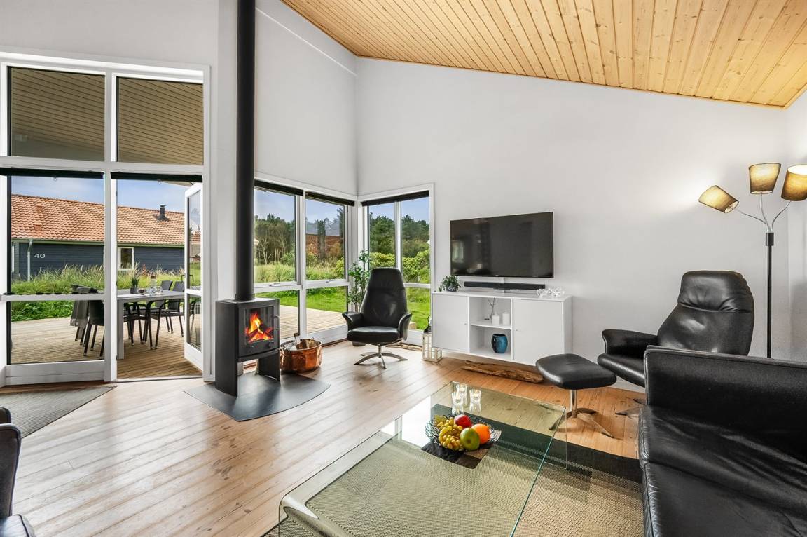 Das Ferienhaus tritt hell und einladend hervor und hat u. a. eine große Fensterfront im Wohnzimmer.