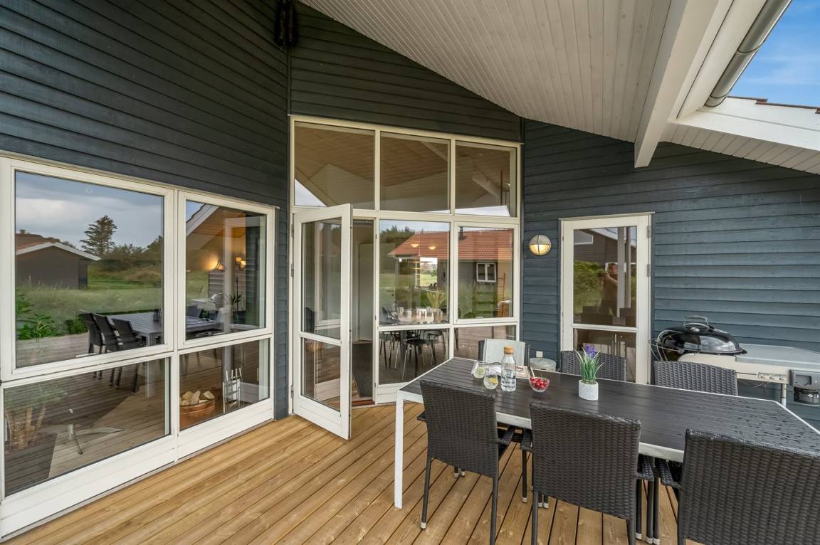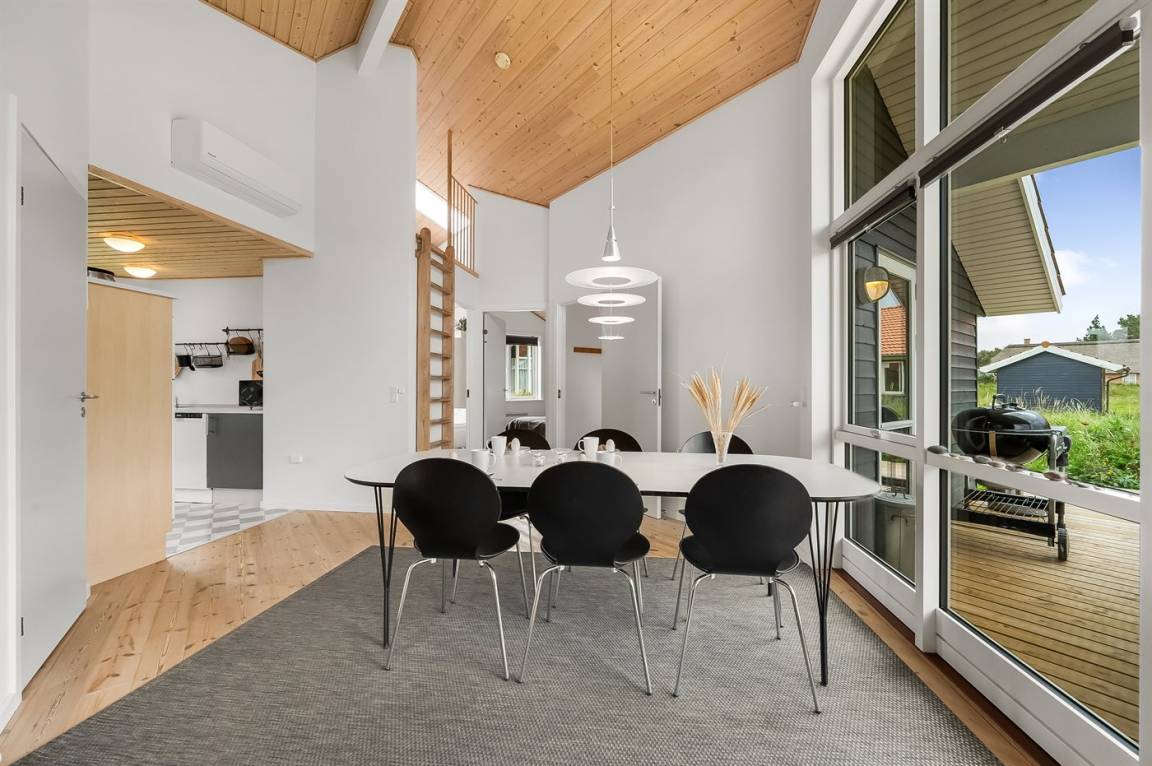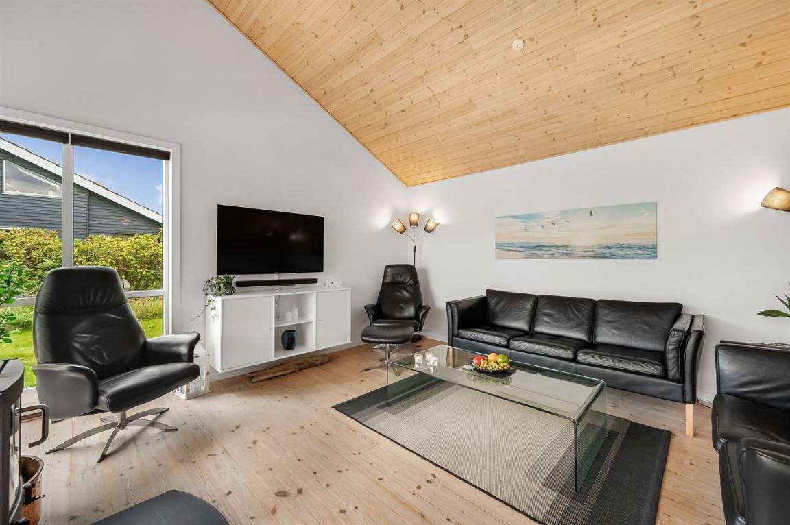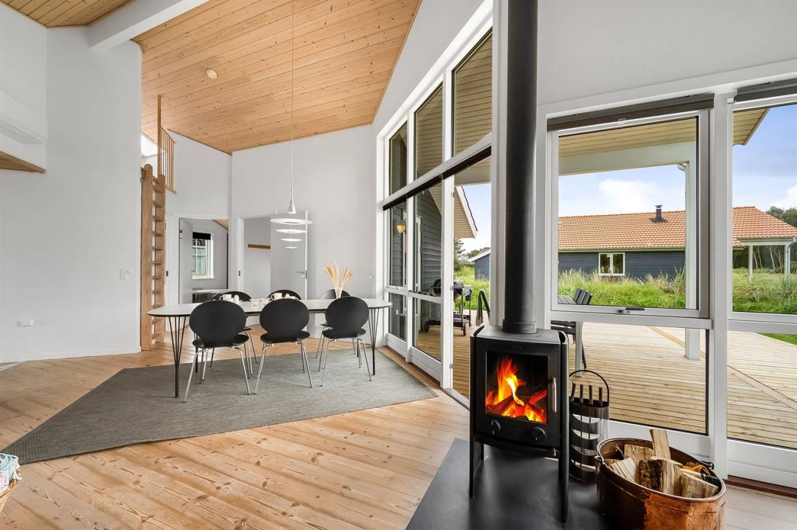 Das Ferienhaus tritt hell und einladend hervor und hat u. a. eine große Fensterfront im Wohnzimmer.