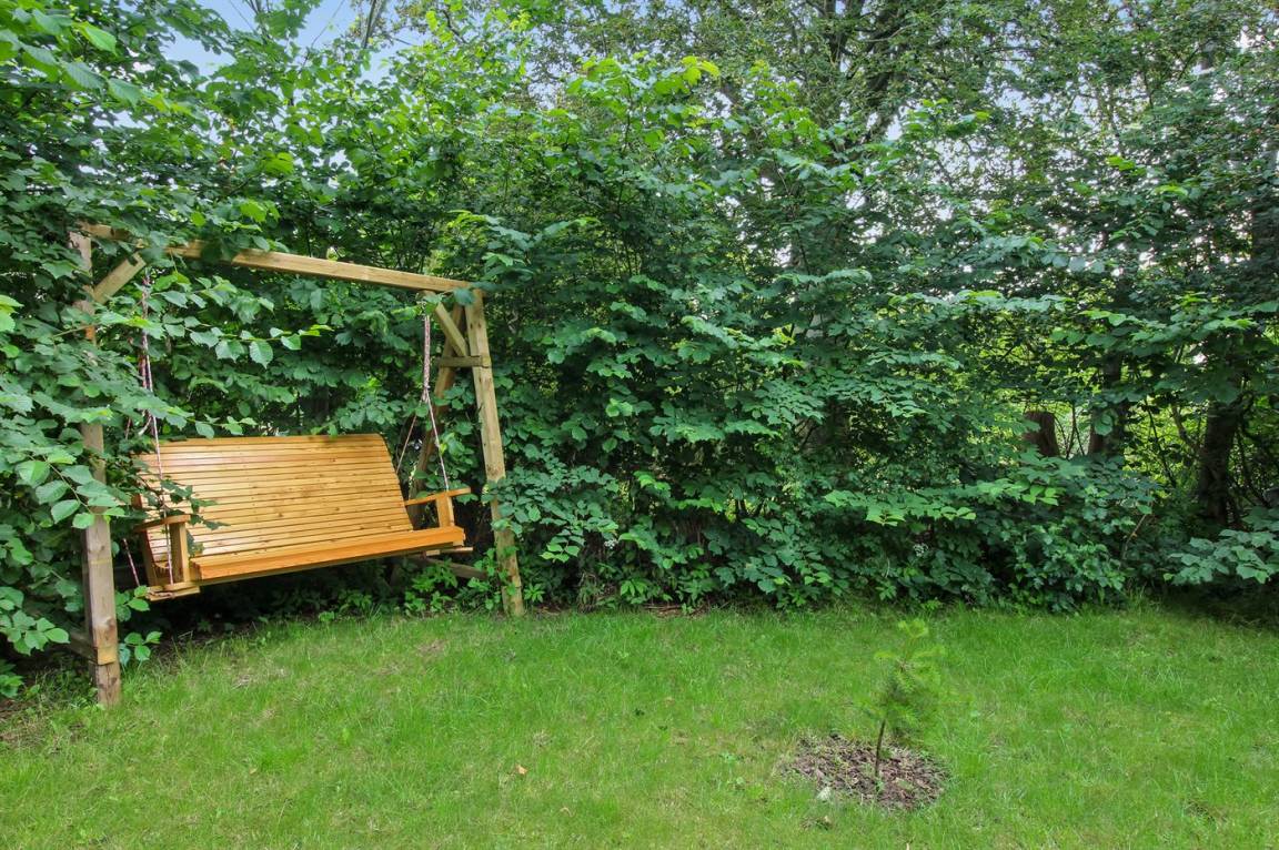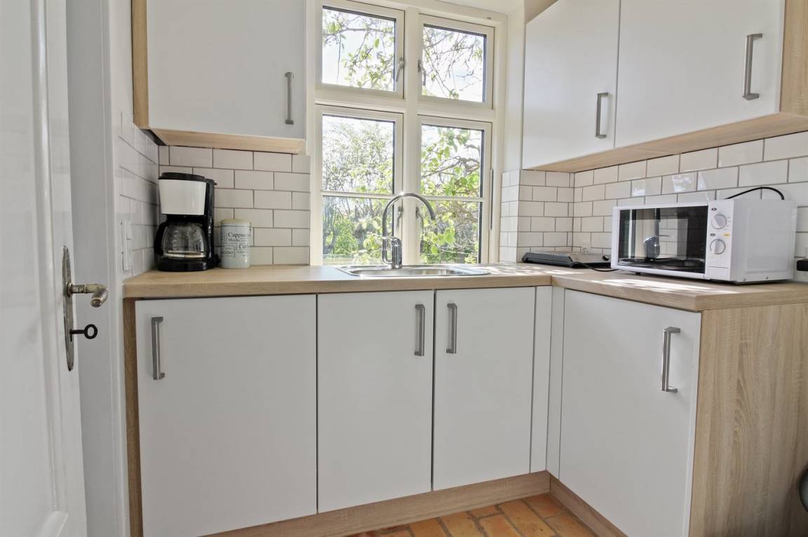 Von der Küche gibt es Zugang zu der Terrasse und einen schönen Garten mit Rasen.