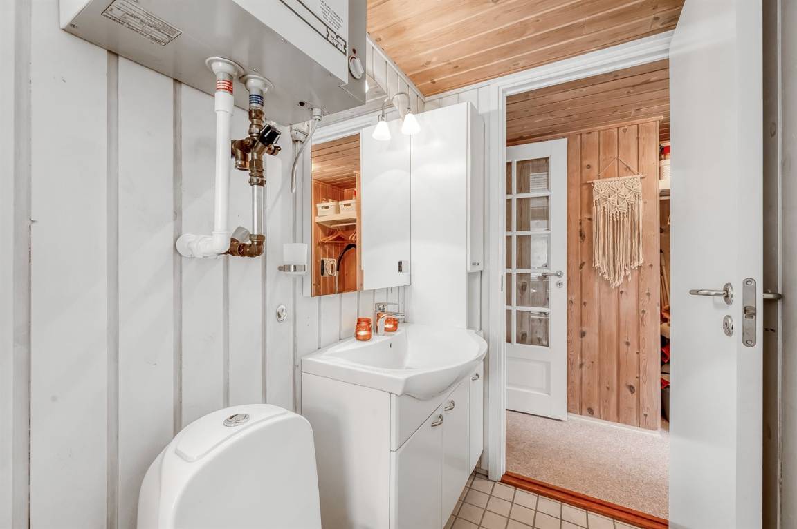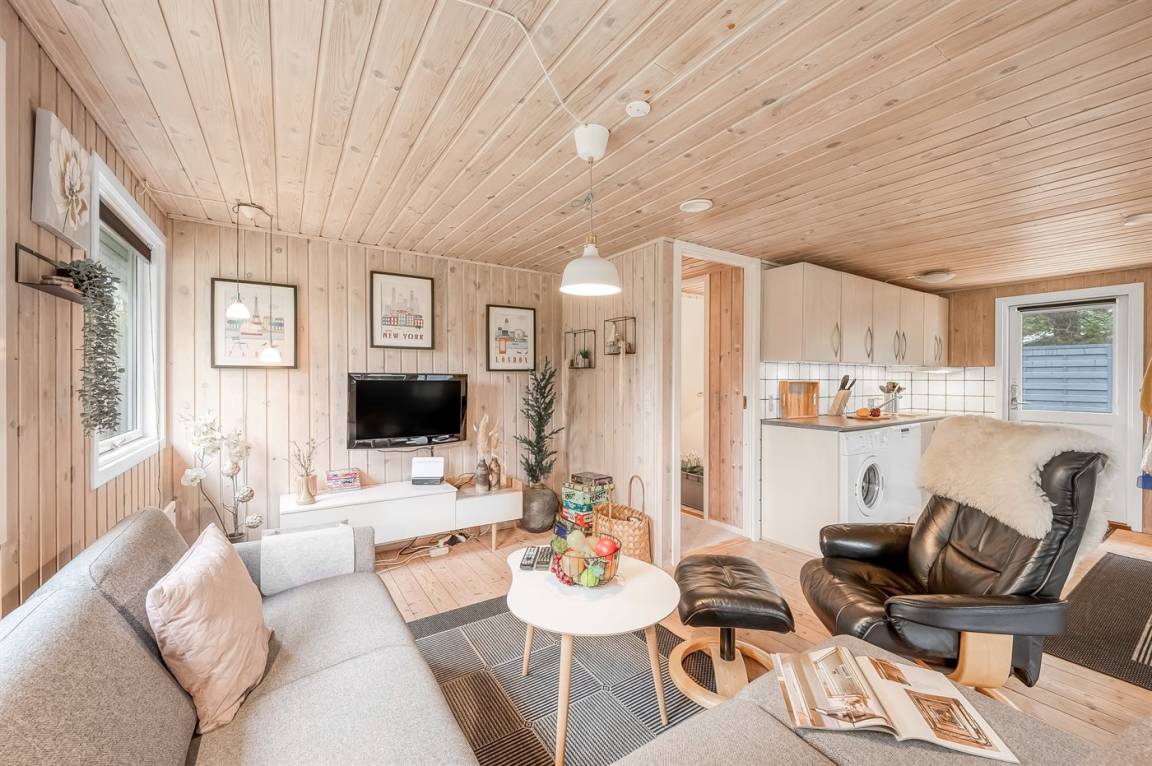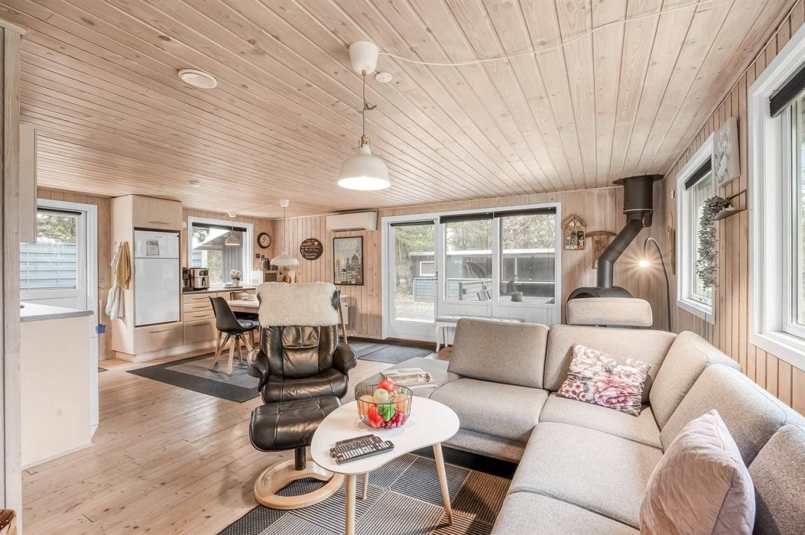 DraußenDie Ferienunterkunft liegt auf einem 986 m² großen Naturgrundstück. Das Grundstück ist eingezäunt. Die Entfernung zum Fjord beträgt 500 m. Die nächste Einkaufsmöglichkeit liegt 1200 m entfernt. Es steht ein offenes Terrassenareal zur Verfügung. Außerdem gibt es überdachte Terrasse. Außensauna. Es steht ein Carport zur Verfügung. Parkplatz auf dem Grundstück.