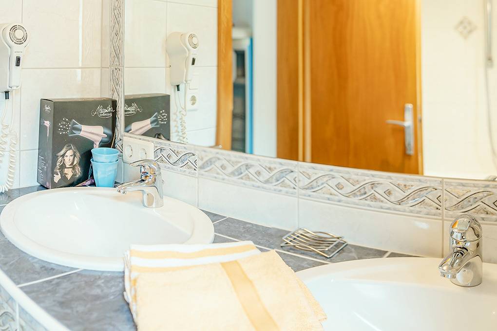 A 154.8 Wohnung 1-5 Pers.: 2 1/2-Zimmerwohnung mit 70 qm Wohnfläche, 1. Etage. Gemütliche Wohnküche mit Esstisch, gut ausgestatteter Küchenzeile (Backofen, Mikrowelle, Spülmaschine), Sat-TV. Doppelzimmer mit Sat-TV, Du, Wb, Balkon. 3-Bettzimmer mit Doppelbett, Schlafcouch, Balkon. Bad: 2 Wb, Bw/ Du. Separates WC.
