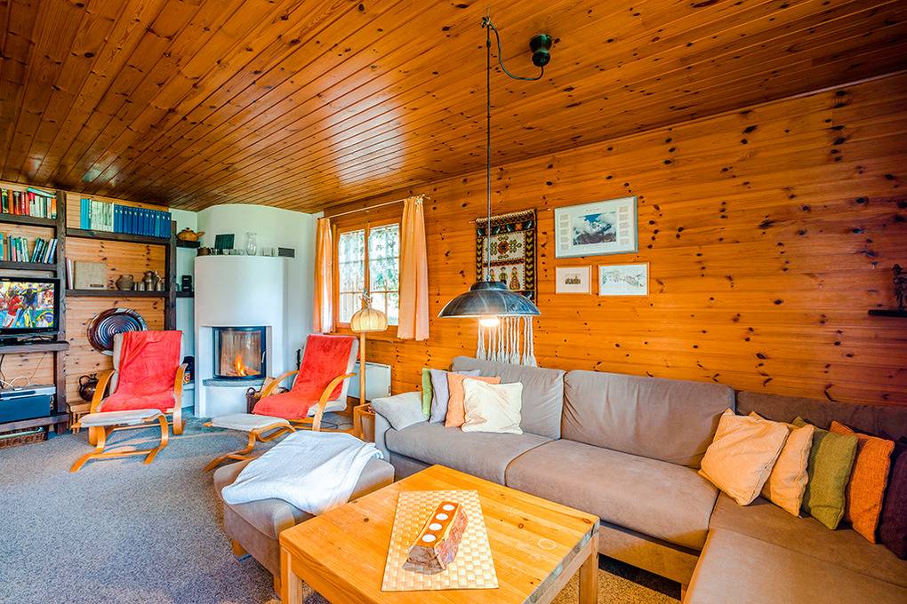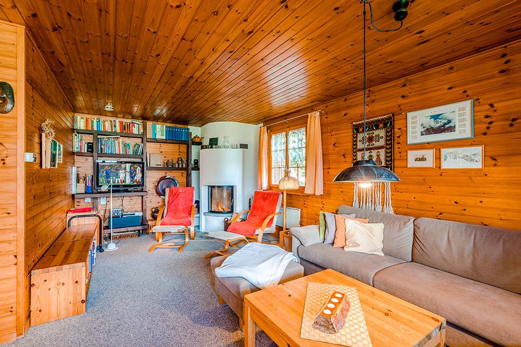 Haus: Schönes Chalet mit Sauna und Kamin. 4-Zimmer-Haus mit ca. 90 qm Wohnfläche über 2 Etagen. Gemütlich-rustikales Chalet-Ambiente mit Holzvertäfelungen im ganzen Haus. Internetzugang über W-Lan. Waschmaschine. Elektroheizung. Warmwasser über 300 l E-Boiler. Balkon, Südterrasse mit Sitzmöbeln. 1 reservierter Pkw-Stellplatz (70 m).