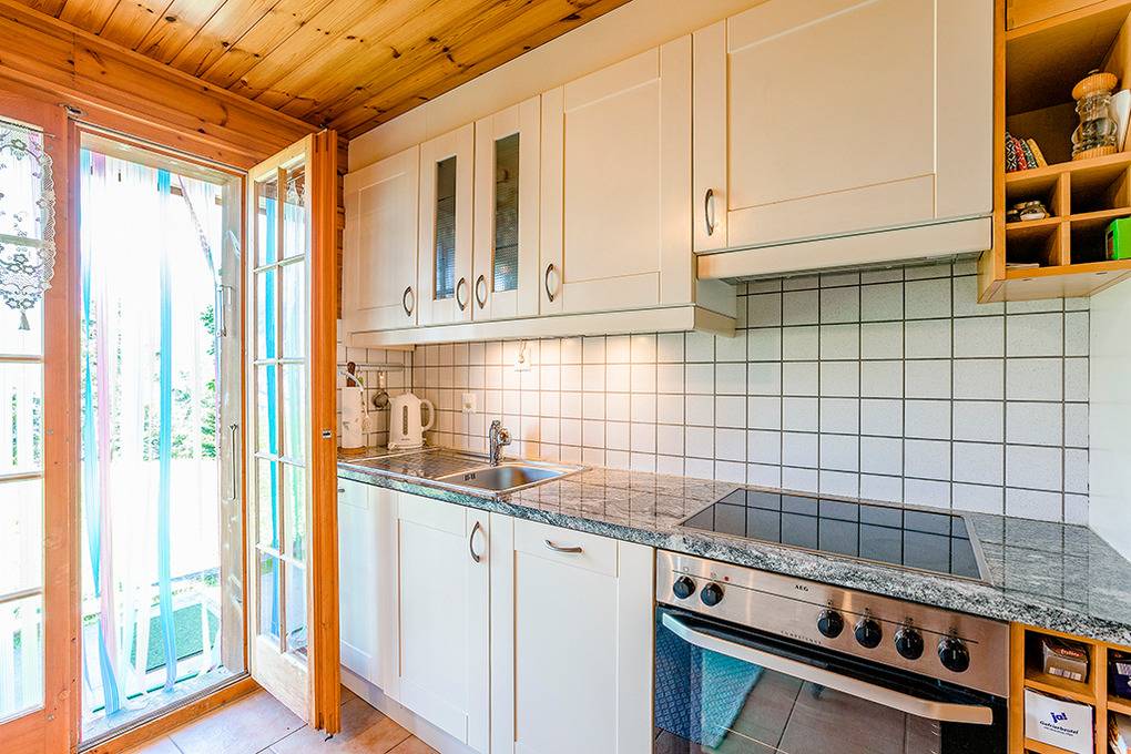 Parterre: Wohnraum mit gemütlicher Sitzgruppe am Kamin, Flachbild-TV, Radio/CD, Esstisch, moderner Küchenzeile (Backofen, Spülmaschine). Bad: Du, Wb, WC. Sauna.
