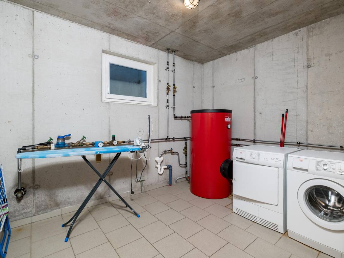 Keller: Waschraum mit Waschmaschine , Ruheraum mit Wellness Badewanne, Dusche, Sauna , Skiabstellraum mit Skischuhheizung , Bügelbrett, Bügeleisen
