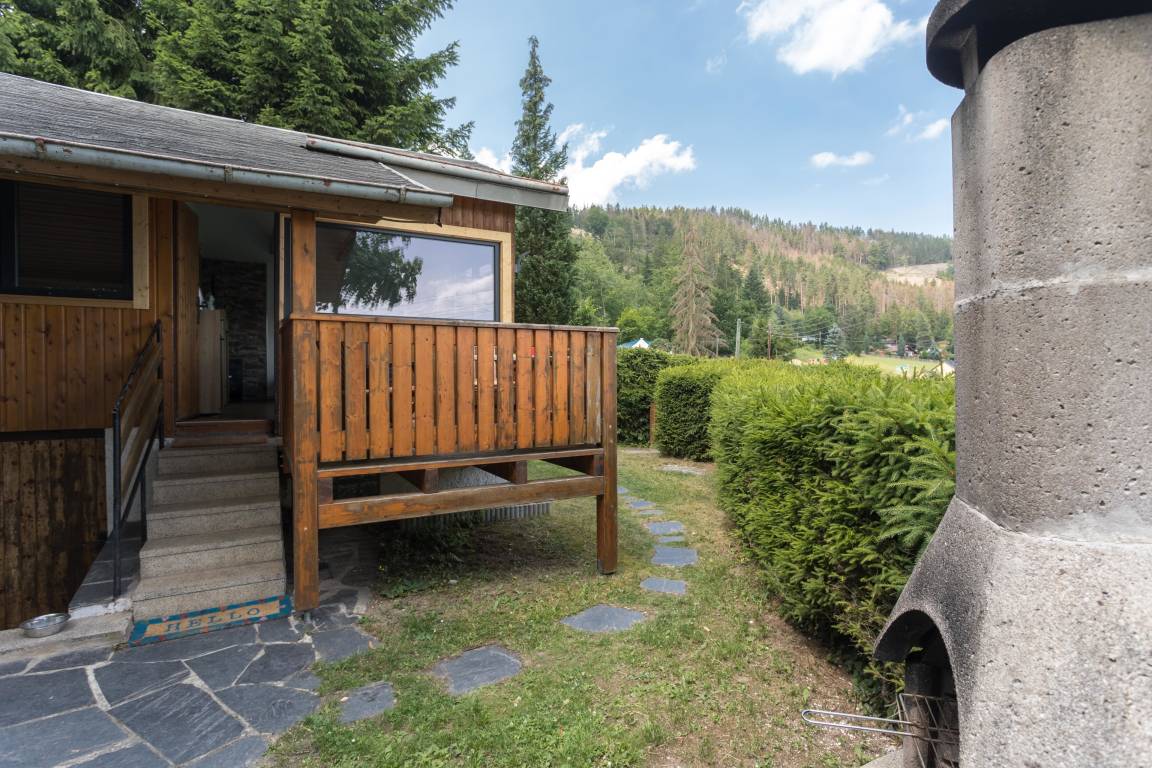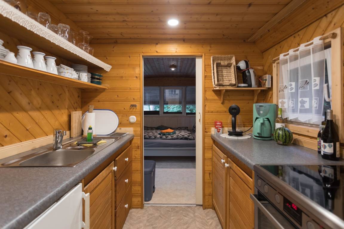 Dieser Bungalow bietet bei einfachem Standard einen atemberaubenden Blick auf die Alterbucht und den Saaleverlauf. Das Grundstück ist knapp 500 qm groß und verfügt über mehrere idyllische Plätzchen - sonnig oder schattig. Umrahmt von hohen Tannen bietet die Fensterfront einen herrlichen freien Blick auf die Saale und die bewaldeten Ufer. Der perfekte Ort zum Ausspannen. Eine überdachte Terrasse spendet Schatten und Schutz vor Regen. Der Bungalow verfügt über ein Schlafzimmer mit einem Doppelbett (1,60 m breit). Das Schlafzimmer ist klein und der Einstieg ins Bett ist nur von einer Seite möglich. Eine doppelte Küchenzeile ist mit Spüle und Herd ausgestattet und verfügt über die notwendigen Geräte: Wasserkocher, Toaster, Kaffeemaschine, Espresso-Maschine, Ceran-Kochfeld. Keine Spülmaschine. Das Wohnzimmer ist geräumig und hell. Es verfügt über einen Esstisch für bis zu 4 Personen und über ein Ecksofa, sowie TV und Radio.