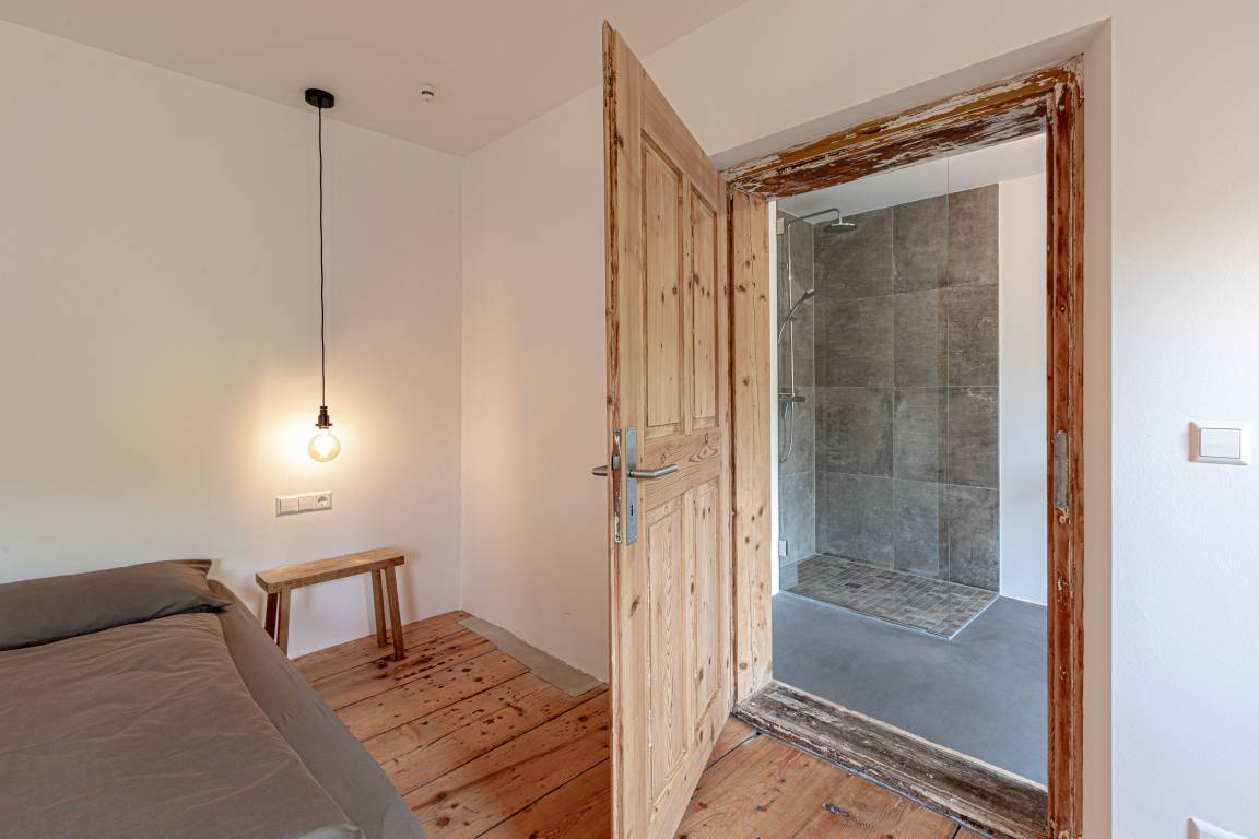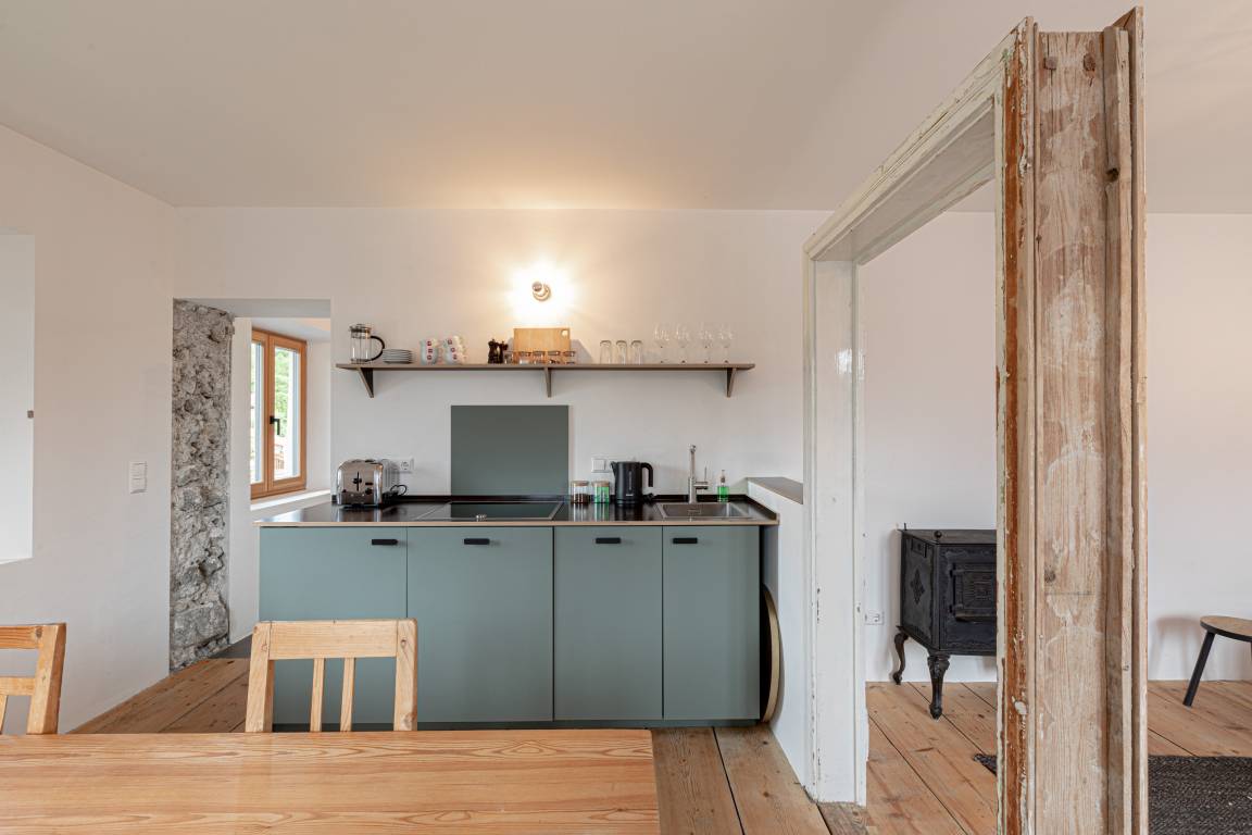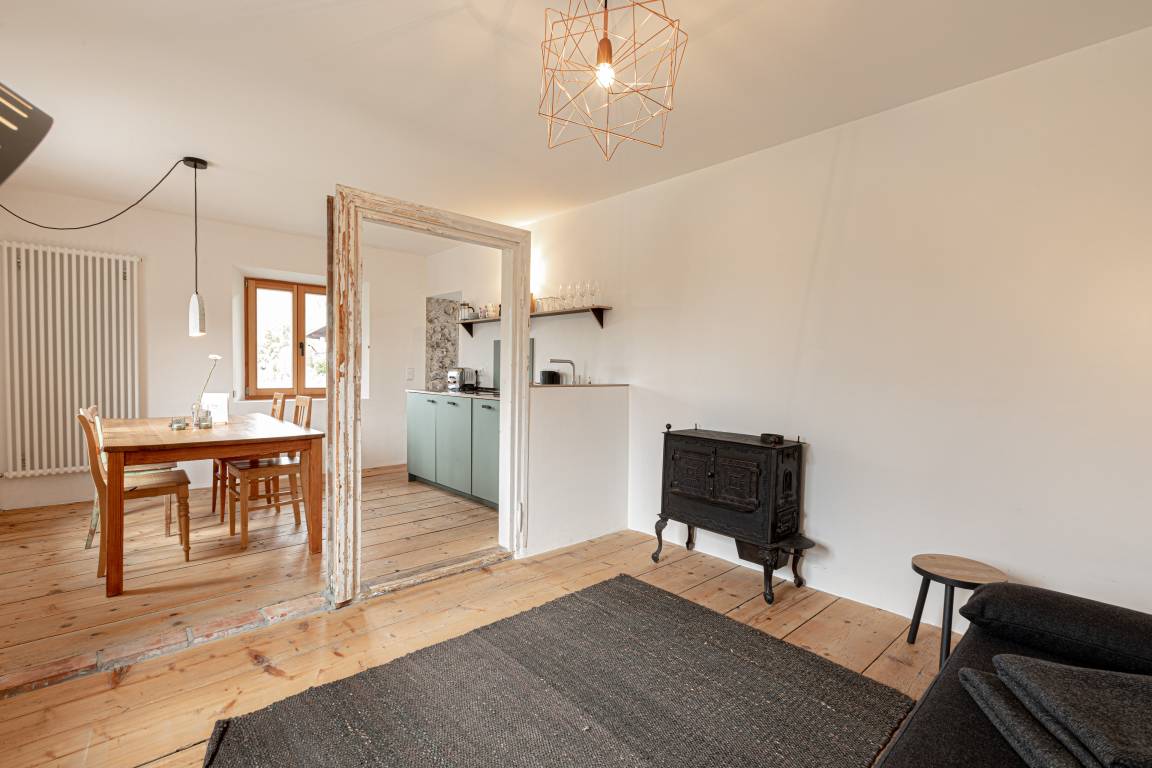 Der offene Wohn- und Essbereich besticht durch alte Holzdielen, eine freigelegte Bachsteinwand und traditionelle Bauelemente, die eine warme Atmosphäre schaffen. Zusätzlich steht im Wohnraum eine Schlafliege (1,60 x 2,00 m) zur Verfügung, die bei Bedarf zwei weitere Schlafplätze bietet.