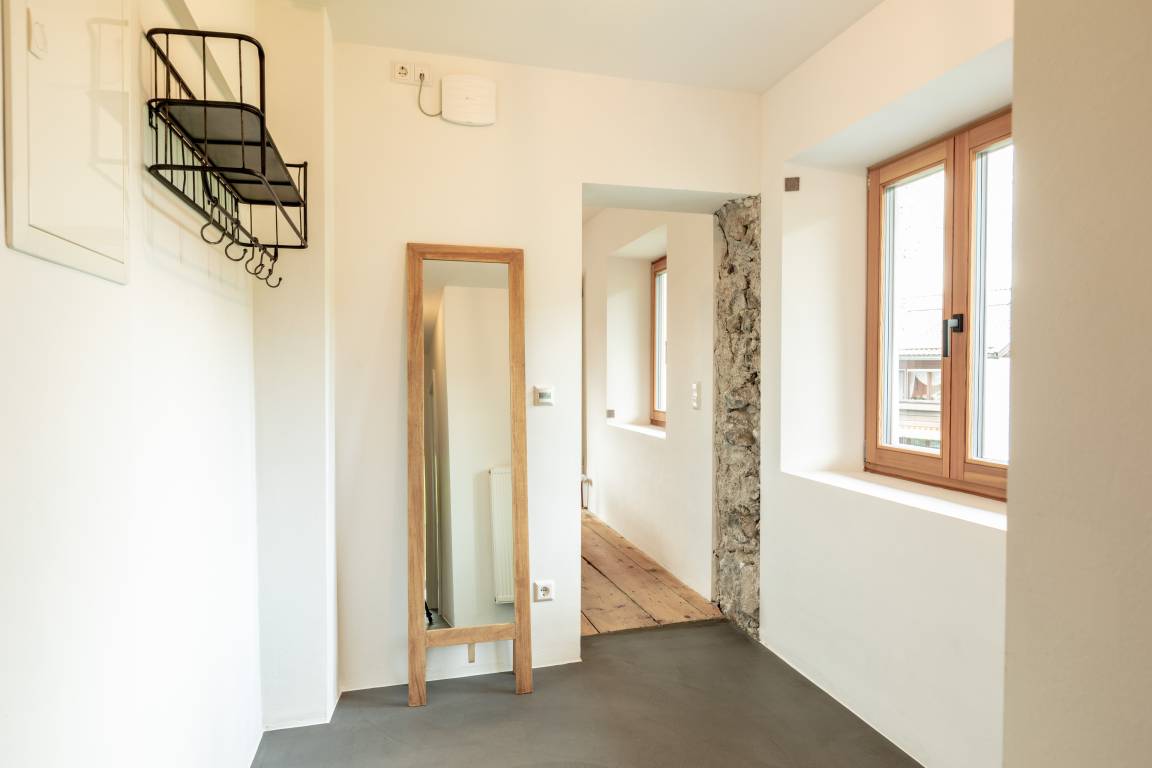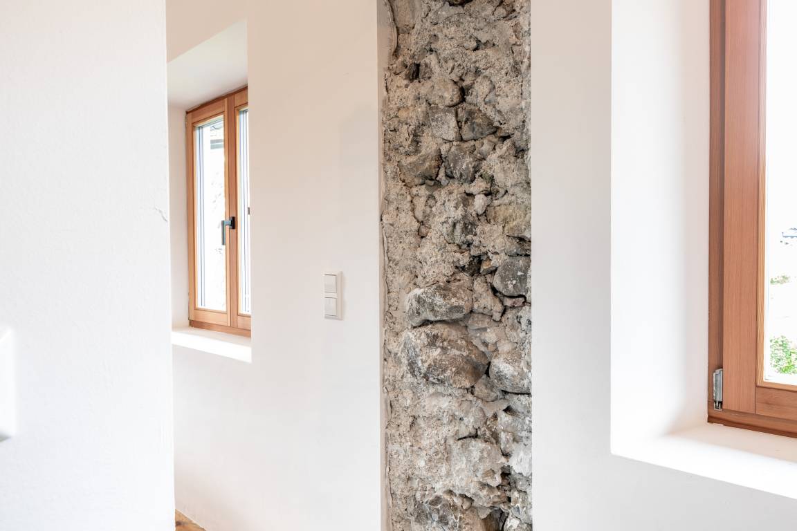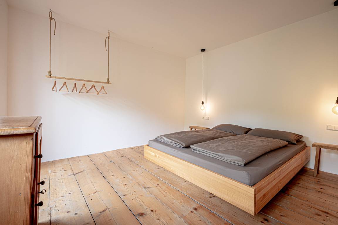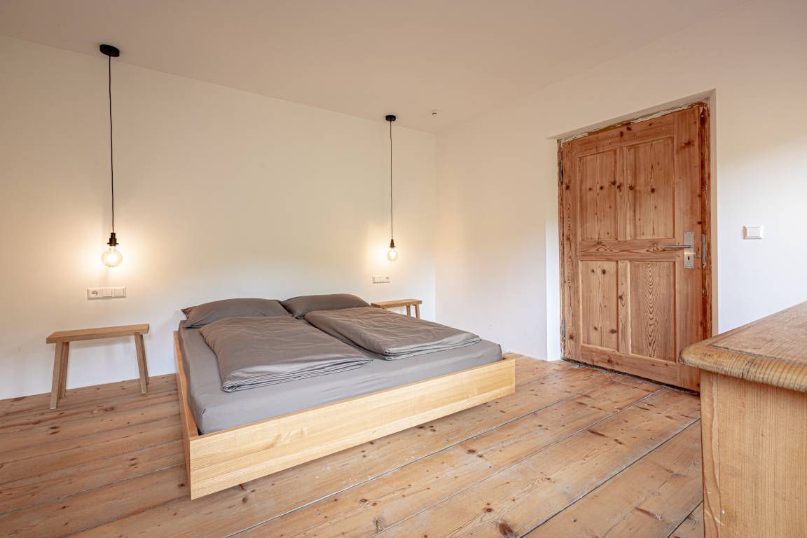 Der offene Wohn- und Essbereich besticht durch alte Holzdielen, eine freigelegte Bachsteinwand und traditionelle Bauelemente, die eine warme Atmosphäre schaffen. Zusätzlich steht im Wohnraum eine Schlafliege (1,60 x 2,00 m) zur Verfügung, die bei Bedarf zwei weitere Schlafplätze bietet.